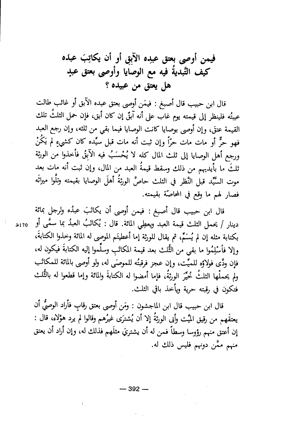 قال ابن حبيب قال أصبغ: فيمن أوصى بعتق عبده الآبق أو غائب طالت عيبتُه فلينظر إلى قيمته يوم غاب على أنه آبقٌ إن كان أبق، فإن حمل الثلث تلك القيمة عتق، وإن أوصى بوصايا كانت الوصايا فيما بقي من ثلثه، وإن رجع العبد فهو حر أو مات مات حراً وإن ثبت أنه مات قبل سيده كان كشيء لم يكن ورجع أهل الوصايا إلى ثلث المال كله لا يُحسب فيه الآبق فأخذوا من الورثة ثلث بأيديهم من ذلك وسقط قيمة العبد من المال، وإن ثبت أنه مات بعد موت السيد قبل النظر في الثلث حاص الورثة أهل الوصايا بقيمته وتلوا ميراثه فصار لهم ما وقع في المحاصة بقيمته.