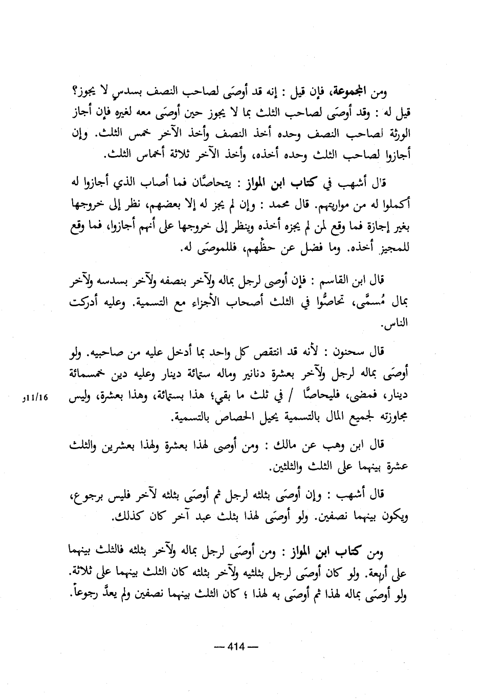 ومن المجموعة، فإن قيل: إنه قد أوصى لصاحب النصف بسدسٍ لا يجوز؟ قيل له: وقد أوصى لصاحب الثلث بما لا يجوز حين أوصى معه لغيره فإن أجاز الورثة لصاحب النصف وحده أخذ النصف وأخذ الآخر خمس الثلث. وإن أجازوا لصاحب الثلث وحده أخذه، وأخذ الآخر ثلاثة أخماس الثلث.