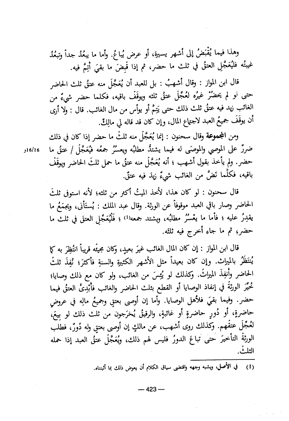 ومن المجموعة وقال سحنون: إنما يُعجل منه ثلث ما حضر إذا كان في ذلك ضررٌ على الموصي والموصى له فيما يشتد مطلبه ويعسرُ جمعُه فيُعجل/ عتقُ ما حضر. ولم يأخذ بقول أشهب؛ أنه يُعجل منه عتقُ ما حمل ثلث الحاضر ويوقف باقيه، فكلما نض من الغائب شيءٌ زيد فيه عتق.