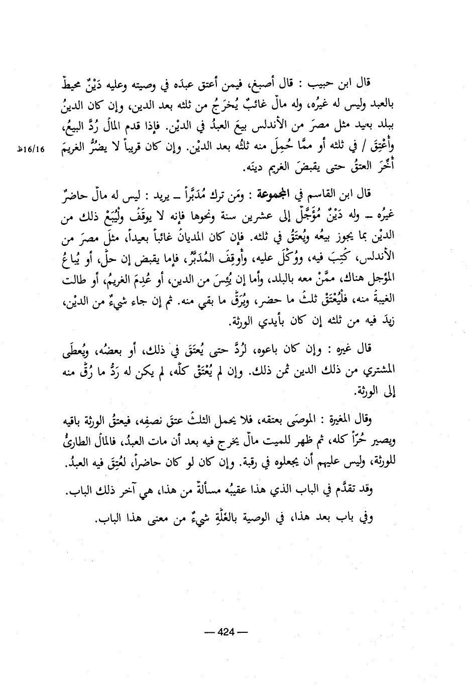 قال ابن القاسم في المجموعة: ومن ترك مُدبراً – يريد: ليس له مالٌ حاضرٌ غيره- وله دينٌ مؤجل إلى عشرين سنة ونحوها فإنه لا يوقف وليُبع ذلك من الدين بما يجوز بيعه ويُعتق في ثلثه. فإن كان المديان غائباً بعيداً، مثل مصر من الأندلس، كُتب فيه، ووُكل عليه، وأوقف المُدبر، فإما يقبض إن حل، أو يُباع المؤجل هناك، ممن معه بالبلد، وأما إن يُئس من الدين، أو عُدم الغريمُ، أو طالت الغيبة منه، فليُعتق ثلث ما حضر، ويُرق ما بقي منه. ثم إن جاء شيءٌ من الدين، زيد فيه من ثلثه إن كان بأيدي الورثة.