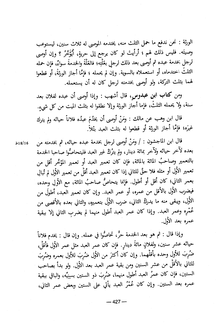 قال ابن الماجشون:/ ومن أوصى لرجل بخدمة عبده حياته، ثم بخدمته من بعده لآخر حياته ولآخر بمائة دينار، ولم يترك غير العبد فليتحاصوا صاحبا الخدمة بالتعمير وصاحبُ المائة بالمائة، فإن كان تعمير العبد أو تعمير المؤخر أقل من تعمير الأول أو مثله فلا حق للثاني إذا كان تعمير العبد أقل من تعمير الأول لم تُبال بعمر الثاني، كان أقل أو أطول. فإنما يتحاص صاحبُ المائة، مع الأول وحده، فيضرب الأول بالأقل من عمره، أو عمر العبد. وإن كان تعمير العبد، أطول من الأول، ويبقى منه ما يدرك الثاني، ضرب الأول بتعميره، والثاني بعده بالأقصى من عُمره وعمر العبد. وإذا كان عمر العبد أطول منهما لم يضرب الثاني إلا ببقية عمره بعد الأول.