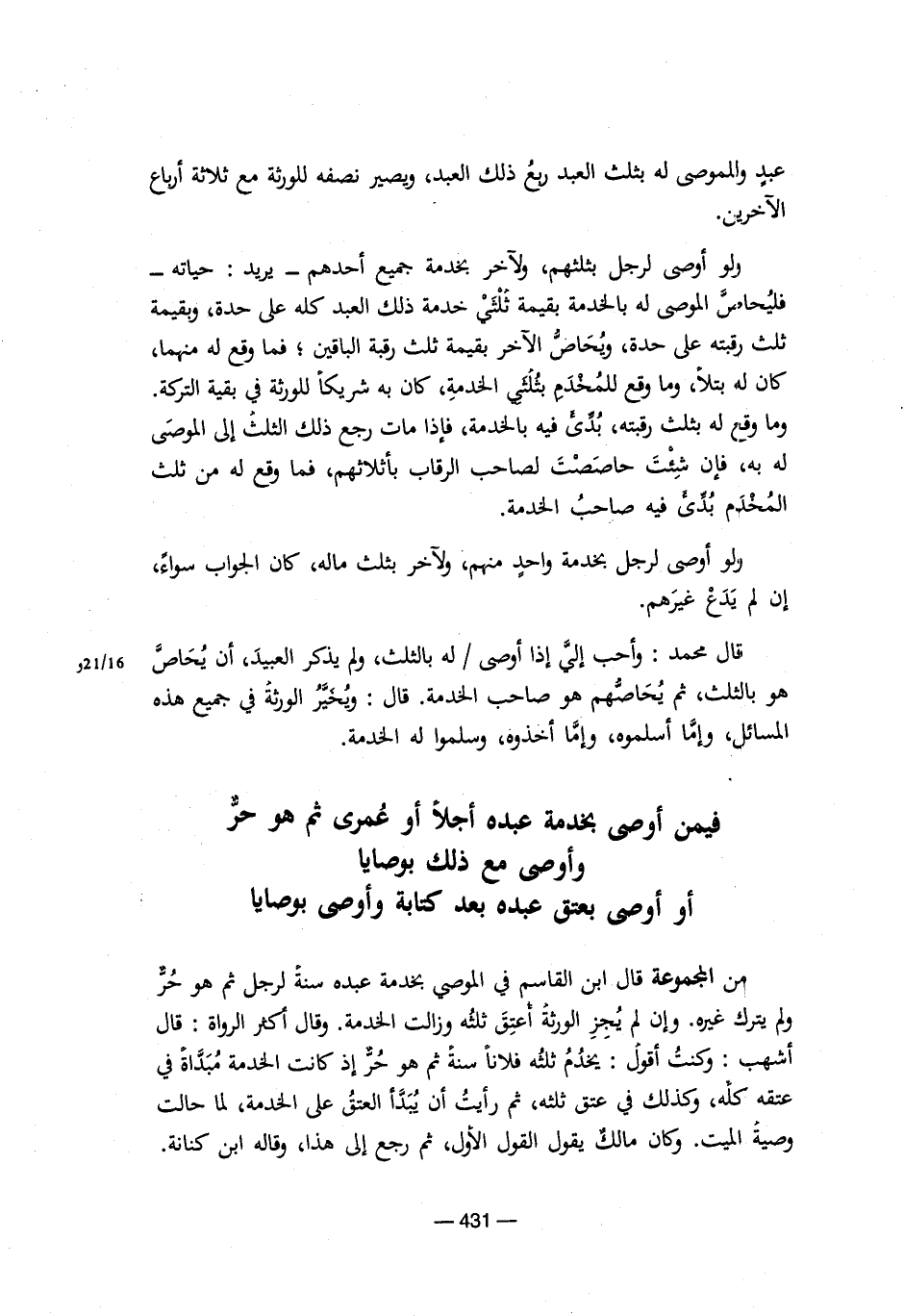 من المجموعة قال ابن القاسم في الموصي بخدمة عبده سنةً لرجل ثم هو حُر ولم يترك غيره. وإن لم يُجز الورثة أُعتق ثلثه وزالت الخدمة. وقال أكثر الرواة: قال أشهب: وكنتُ أقولُ: يخدُمُ ثلثه فلاناً سنةً ثم هو حُر إذ كانت الخدمة مُبداةً في عتقه كله، وكذلك في عتق ثلثه، ثم رأيت أن يُبدأ العتقُ على الخدمة، لما حالت وصيةُ الميت. وكان مالكٌ يقول القول الأول، ثم رجع إلى هذا، وقاله ابن كنانة.