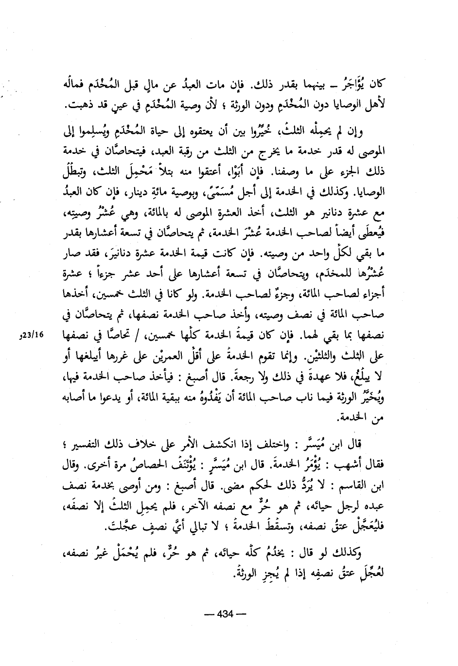قال ابن مُيسر: واختلف إذا انكشف الأمر على خلاف ذلك التفسير؛ قال أشهب: يُؤمر الخدمة. قال ابن مُيسرٍ: يُؤتنف الحصاص مرة أخرى. وقال ابن القاسم: لا يُرد ذلك لحكم مضى. قال أصبغ: ومن أوصى بخدمة نصف عبده لرجل حياته، ثم هو حُر مع نصفه الآخر، فلم يحمل الثلث إلا نصفه، فليُعجل عتقُ نصفه، وتسقط الخدمة؛ لا تبالي أي نصفٍ عجلت.