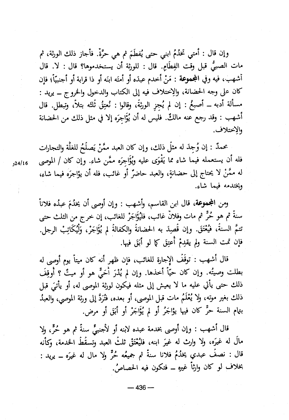 قال أشهب: توقف الإجارة للغائب، فإن ظهر أنه كان ميتاً يوم أوصي له بطلت وصيته. وإن كان حياً أخذها. وإن لم يدر أحي هو أو ميت؟ أوقف ذلك حتي يأتي عليه ما لا يعيش إلي مثله فيكون لورثة الموصي له، أو يأتي قبل ذلك بغير موته، ولا يعلم مات قبل الموصي، أو بعده، فترد إلي ورثة الموصي، والعبد بتمام السنة حر كان فيها يؤاجر أو لم يؤاجر أو أبق أو مرض.