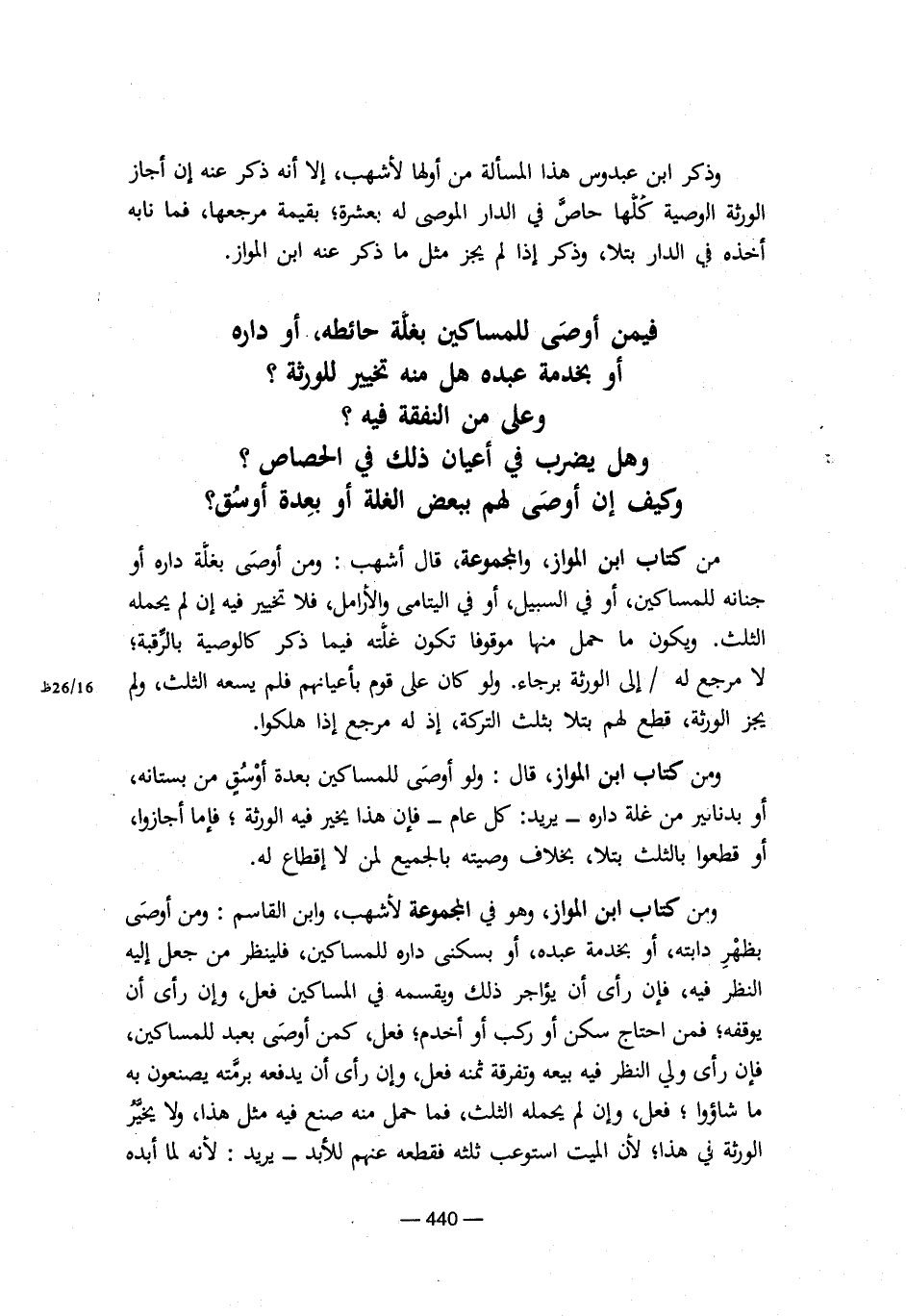 من كتاب ابن المواز، والمجموعة، قال أشهب: ومن أوصي بغلة داره أو جنانه للمساكين، أو في السبيل، أو في اليتامي والأرامل، فلا تخيير فيه إن لم يحمله الثلث. ويكون ما حمل منها موقوفا تكون غلته فيما ذكر كالوصية بالرقبة؛ لا مرجع له / إلي الورثة برجاء. ولو كان علي قوم بأعيانهم فلم يسعه الثلث، ولم يجز الورثة، قطع لهم بتلا بثلث التركة، إذ له مرجع إذا هلكوا.