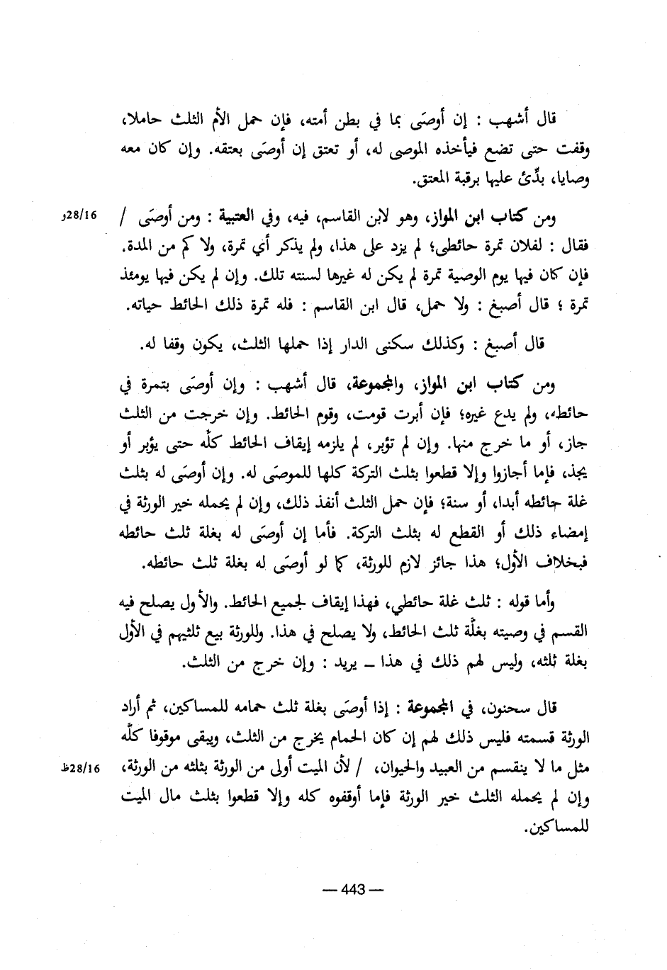 وأما قوله: ثلث غلة حائطي، فهذا إيقاف لجميع الحائط. والأول يصلح فيه القسم في وصيته بغلة ثلث الحائط، ولا يصلح في هذا. وللورثة بيع ثلثيهم في الأول بلغة ثلثه، وليس لهم ذلك في هذا ـ يريد: وإن خرج من الثلث.