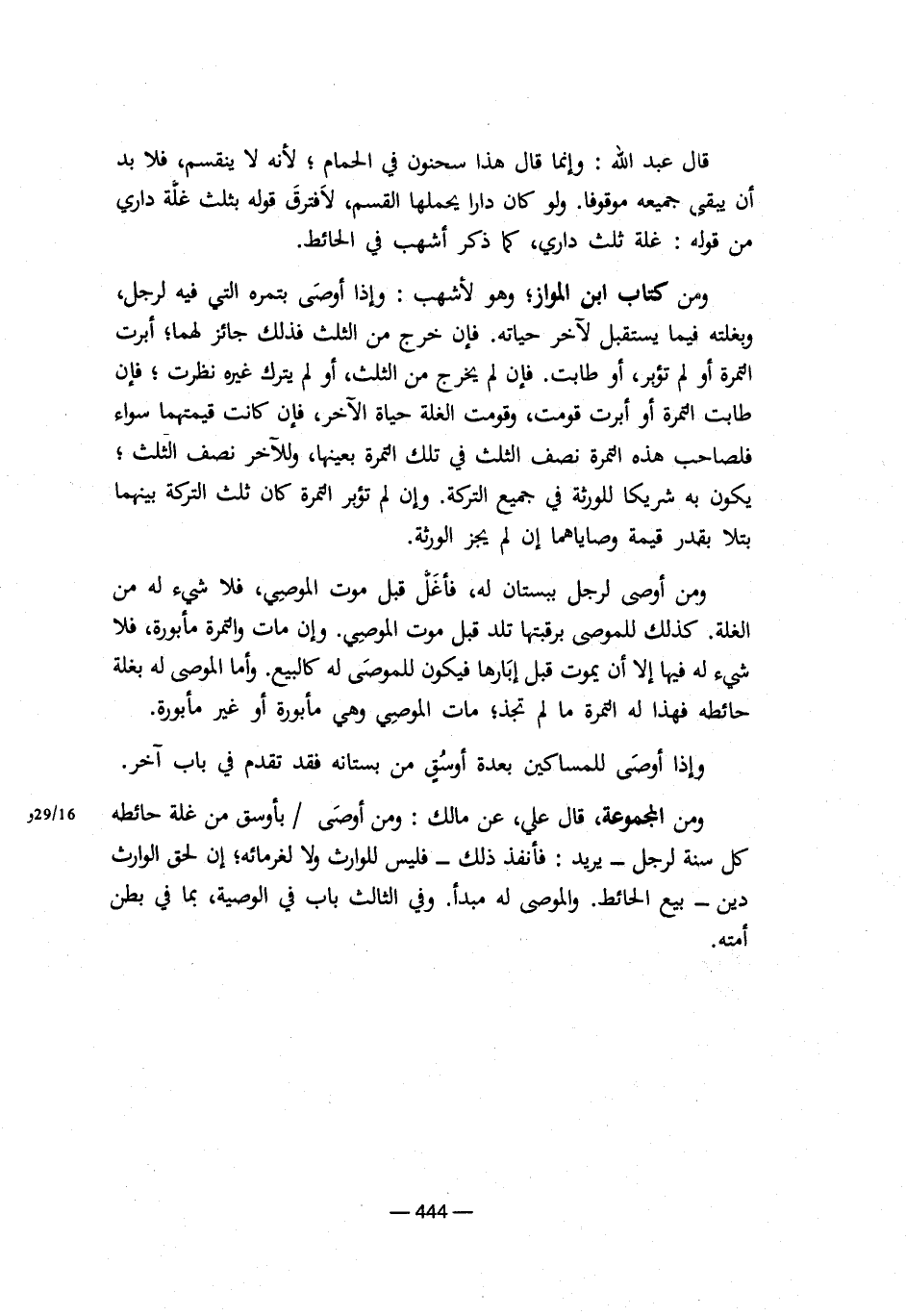 ومن المجموعة، قال علي، عن مالك: ومن أوصي / بأوسق من غلة حائطه كل سنة لرجل ـ يريد: فأنفذ ذلك ـ فليس للوارث ولا لغرمائه؛ إن لحق الوارث دين ـ بيع الحائط. والموصي له مبدأ. وفي الثالث باب الوصية، بما في بطن أمته.