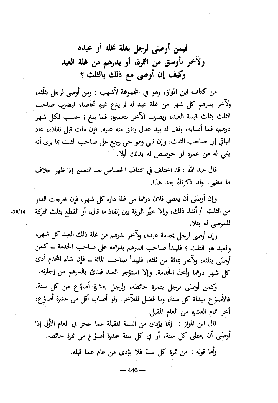 من كتاب ابن المواز، وهو في المجموعة لأشهب: ومن أوصي لرجل بثلثه، ولآخر بدرهم كل شهر من غلة عبد له لم يدع غيره تحاصا؛ فيضرب صاحب الثلث بثلث قيمة العبد، ويضرب الآخر بتعميره، فما بلغ؛ حسب لكل شهر درهم فما أصابه، وقف له بيد عدل ينفق منه عليه. فإن مات قبل نفاذه، عاد الباقي إلي صاحب الثلث. وإن فني وهو حي رجع علي صاحب الثلث بما يري أنه يفي له من عمره لو حوصص له بذلك أولا.