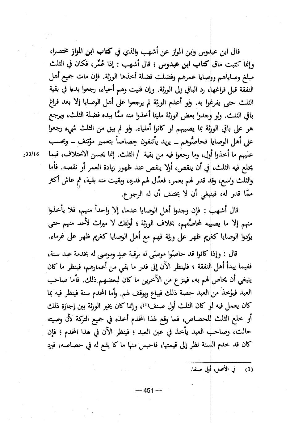 قال ابن عبدوس وابن المواز عن أشهب والذي في كتاب ابن المواز مختصرا، وإنما كتبت ماق كتاب ابن عبدوس؛ قال اشهب: إذا عمر، فكان في الثلث مبلغ وصاياهم ووصايا عمرهم وفضلت فضلة أخذها الورثة. فإن مات جميع أهل النفقة قبل فراغها، رد الباقي إلي الورثة. وإن فنيت وهم أحياء، رجعوا بدءا في بقية الثلث حتي يفرغوا به. ولو أعدم الورثة لم يرجعوا علي أهل الوصايا إلا بعد فراغ باقي الثلث. ولو وجدوا بعض الورثة مليئا أخذوا منه مما بيده فضلة الثلث، ويرجع علي أهل لاوصايا فحاصوهم ـ يريد يأتنفون حصاصاً بتعمير مؤتنف ـ ويحسب عليهم ما أخذوا أول، وما رجعوا فيه من بقية / الثلث. إنما يحسن الاختلاف، فيما يخلع فيع الثلث، في أن ينقص، أولا ينقص عند ظهور زيادة العمر أو نقصه. فأما والثلث واسع، وقد قدر لهم بعمر، فعدل لهم قدره، وبقيت منه بقية، ثم عاش أكثر مما قدر له، فينبغي أن لا يختلف أن له الرجوع.