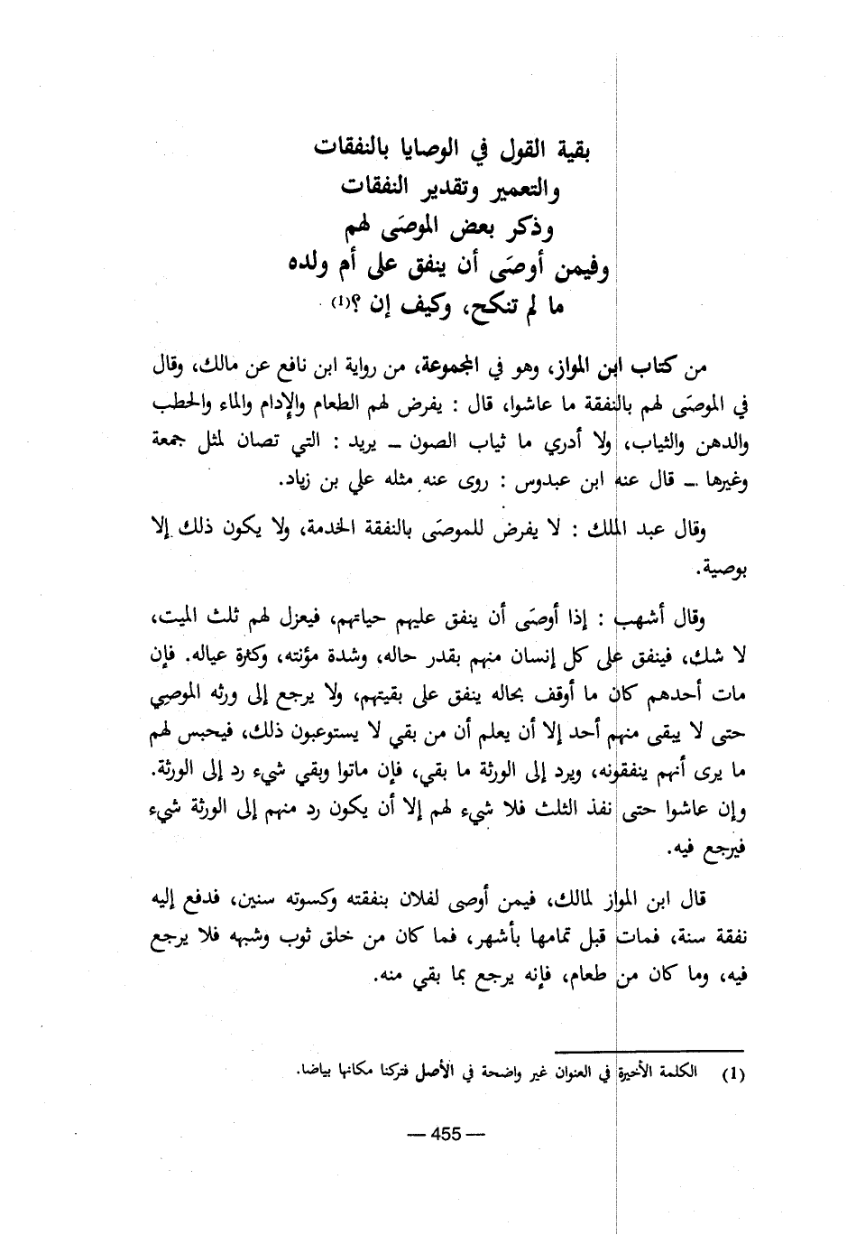 من كتاب ابن المواز، وهو في المجموعة، من رواية ابن نافع عن مالك، وقال في الموصي لهم بالنفقة ما عاشوا، قال: يفرض لهم الطعام والإدام والماء والحطب والدهن والثياب، ولا أدري ما ثياب الصون ـ يريد: التي تصان لمثل جمعة وغيرها ـ قال عنه ابن عبدوس: روي عنه مثله علي بن زياد.