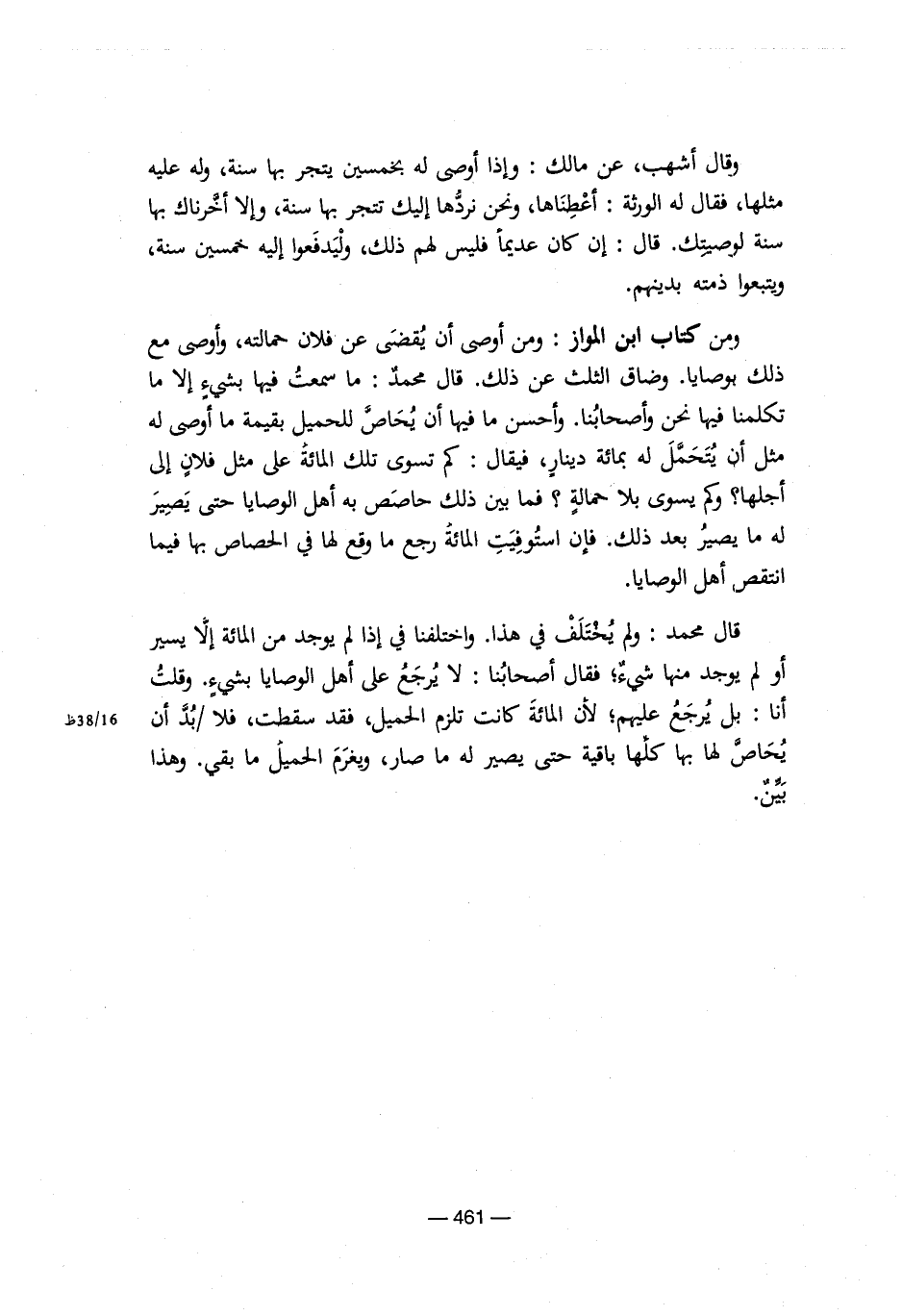 ومن كتاب ابن المواز: ومن أوصي أن يقضي عن فلان حمالته، وأوصي مع ذلك بوصايا. وضاق الثلث عن ذلك. قال محمد: ما سمعت فيها بشئ إلا ما تكلمنا فيها نحن وأصحابنا. وأحسن ما فيها أن يحاص للحميل بقيمة ما أوصي له مثل أن يتحمل له بمائة دينار، فيقال: كم تسوي تلك المائة علي مثل فلان إلي أجلها؟ وكم يسوي بلا حمالة؟ فما بين ذلك حاصص به أهل الوصايا حتي يصير له ما يصير بعد ذلك. فإن استوفيت المائة رجع ما وقع لها في الحصاص بها فيما انتقض أهل الوصايا.