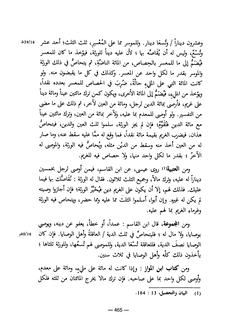 وعشرون دينارا / وتسعا دينار. وللموسر مما علي المعسر، ثلث الثلث؛ أحد عشر وتسع، وليس له أن يقاصه بها؛ لأن عليه ديناً للورثة، فيؤخذ ما كان للمعسر فيضم إلي ما للمعسر بالحصاص، من المائة الناضة، ثم يتحاص في ذلك الورثة والموسر بقدر ما لكل واحد عن المعسر. وكذلك في كل ما يقبضون منه. ولو كانت المائة التي علي الملئ حالة، ضرب في الحصاص للمعسر بعدده نقداً، ويؤخذ من الملئ، فيضم إلي المائة الأخري، ويكون كمن ترك مائتين عيناً ومائة ديناً علي غريم، فأوصي بمائة الدين لرجل، ومائة من العين لآخر، ثم ذلك علي ما مضي من التفسير. ولو أوصي للمعدم بما عليه، ولآخر من العين، وترك مائتين عيناً مع مائة الدين فتقوم؛ فإن لم يجز الورثة، سلموا ثلث العين والدين، فيتحاص هذان، فيضرب الغريم بقيمة مائة نقدراً، وقع له مما عليه سقط عنه، وما صار له من العين أخذ منه وسقط من الدين مثله، ويحاص فيه الورثة، والموصي له الآخر؛ بقدر ما لكل واحد منها، ولا حصاص فيه للغريم.