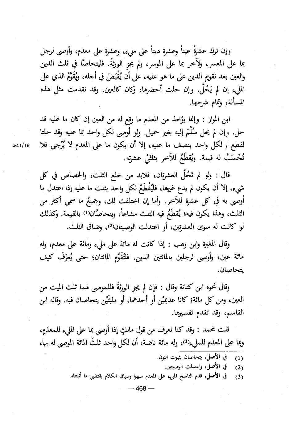 قلت لمحمد: وقد كنا نعرف من قول مالك إذا أوصي بما علي الملئ للمعدم، وبما علي المعدم للملئ (¬3)، وله مائة ناضة، أن لكل واحد ثلث المائة الموصي له بها،