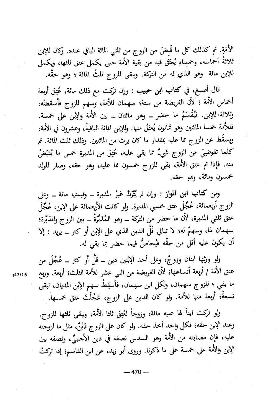 قال أصبغ، في كتاب ابن حبيب: وإن تركت مع ذلك مائة، عتق أربعة أخماس الأمة؛ لأن الفريضة من ستة؛ سهمان للأمة، وسهم للزوج فأسقطته، وثلاثة للابن. فيقسم ما حضر ـ وهو مائتان ـ بين الأمة والابن علي خمسة. فللأمة خمسا المائتين وهو ثمانون يعتق منها. وللابن المائة الباقية، وعشرون في الأمة، ويسقط عن الزوج مما عليه بمقدار ما كان يرث من المائتين. وذلك ثلث المائة. ثم كلما تقوضي من الزوج مما عليه بمقدار ما كان يرث من المائتين. وذلك ثلث المائة. ثم كلما تقوضي من الزوج شئ مما بقي عليه، عتق من المدبرة خمس ما يقبض منه. فإذا تم عتق الأمة، بقي للزوج خمسون مما عليه، وهو حقه، وصار للولد خمسون ومائة، وهو حقه.