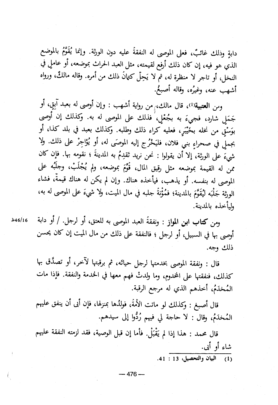 ومن العتبية (¬1)، قال مالك، من رواية أشهب: وإن أوصي له بعبد أبق، أو جمل شارد، فجئ به بجعل، فذلك علي الموصي له به. وكذلك إن أوصي بوسق من نخله بخيبر، فعليه كراء ذلك وطلبه. وكذلك بعبد فب بلد كذا، أو بجمل في صحراء بني فلان، فليخرج إليه الموصي له، أو يؤاجر علي ذلك. ولا شئ علي الورثة، إلا أن يقولوا: نحن نريد تقدم به المدينة؛ نقومه بها. فإن كان ممن له القيمة بموضعه مثل رقيق المال، قوم بموضعه، ولم يجلب، وجلبه علي الموصي له بنفسه. أو يذهب، فيأخذه هناك. وإن لم يكن له هناك قيمة، فشاء الورثة جلبه ليقوم بالمدينة؛ فمؤنة جلبه في مال الميت، ولا شئ علي الموصي له به، وليأخذه بالمدينة.