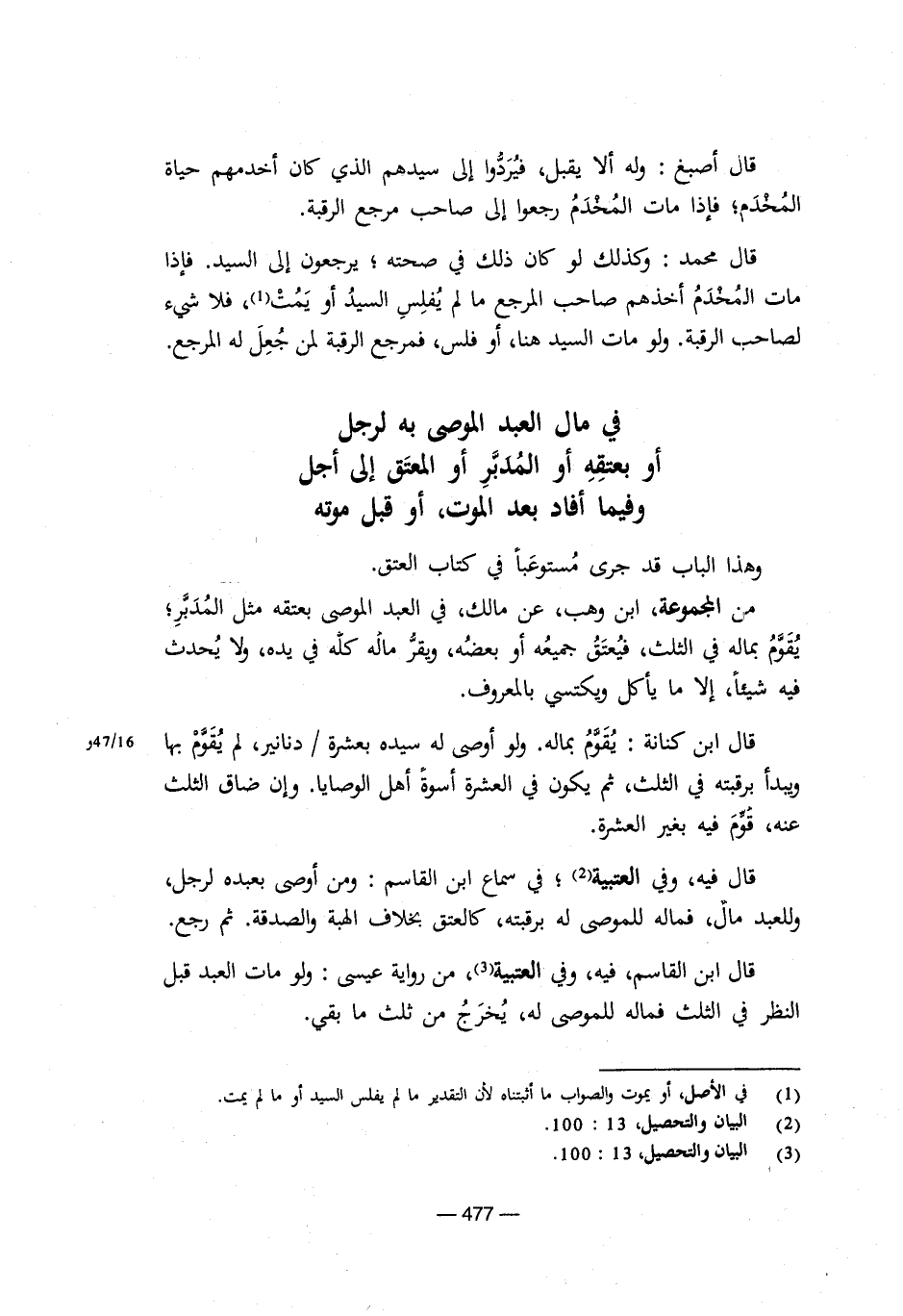 من المجموعة، ابن وهب، عن مالك، في العبد الموصي بعتقه مثل المدبر؛ يقوم بماله في الثلث، فيعتق جميعه أو بعضه، ويقر ماله كله في يده، ولا يحدث فيه شيئاً، إلا ما يأكل ويكتسي بالمعروف.