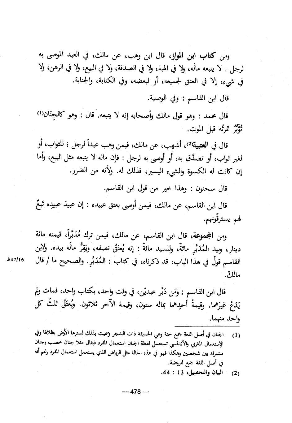 ومن كتاب ابن المواز، قال ابن وهب، عن مالك، في العبد الموصي به لرجل: لا يتبعه ماله، ولا في الهبة، ولا في الصدقة، ولا في البيع، ولا في الرهن، ولا في شئ، إلا في العتق لجميعه، أو لبعضه، وفي الكتابة، والجنابة.