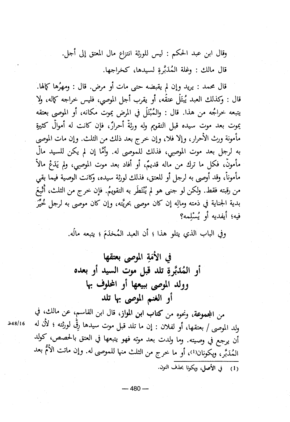 من المجموعة، ونحوه من كتاب ابن المواز، قال ابن القاسم، عن مالك، في ولد الموصي / بعتقها، أو لفلان: إن ما تلد قبل موت سيدها رق لورثته؛ لأن له أن يرجع في وصيته. وما ولدت بعد موته فهو يتبعها في العتق بالحصص، كولد المدبر، ويكونان (¬1)، أو ما خرج من الثلث منها للموصي له. وإن ماتت الأم بعد