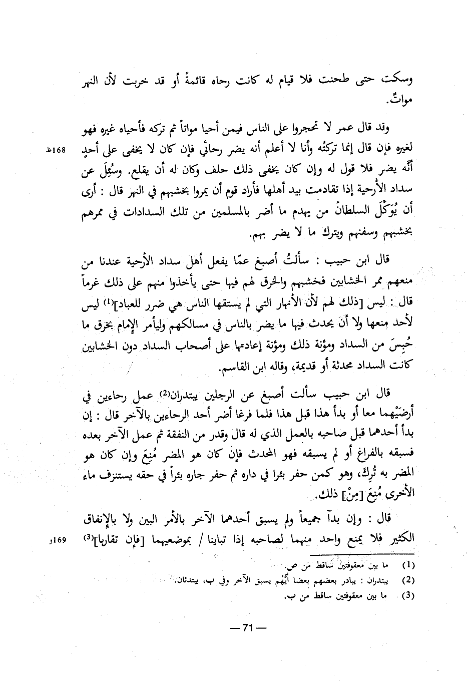 وقد قال عمر لا تحجروا على الناس فيمن أحيا مواتاً ثم تركه فأحياه غيره فهو لغيره فإن قال إنما تركته وأنا لا أعلم أنه يضر رحائي فإن كان لا يخفى على أحدٍ أنه يضر فلا قول له وإن كان يخفى ذلك حلف وكان له أن يقلع. وسُئل عن سداد الأرحية إذا تقادمت بيد أهلها فأراد قوم أن يمروا بخشبهم في النهر قال: أرى أن يُوكل السلطان من يهدم ما أضر بالمسلمين من تلك السدادات في ممرهم بخشبهم وسفنهم ويترك ما لا يضر بهم.