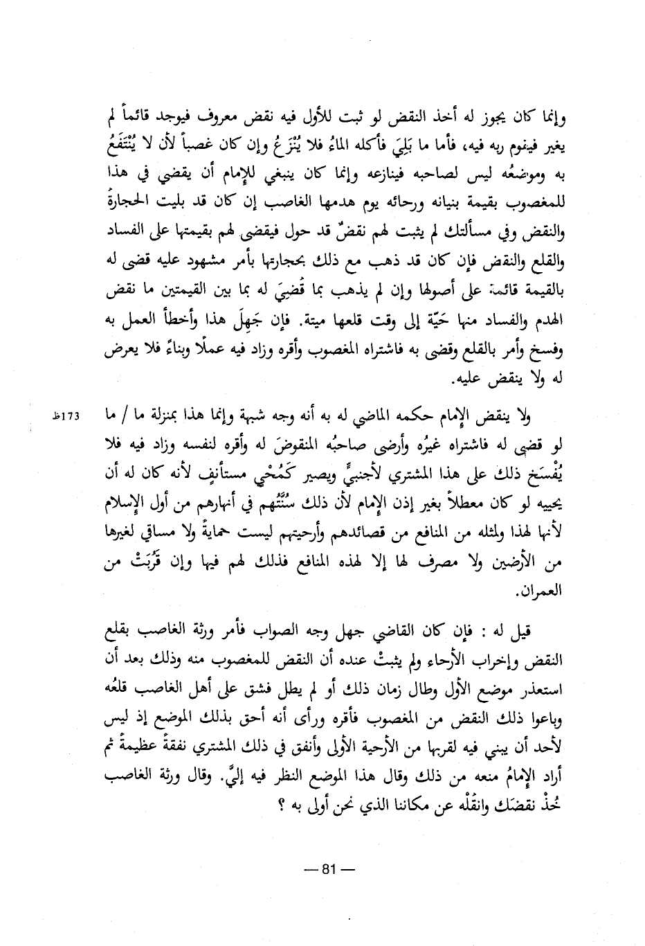 قيل له: فإن كان القاضي جهل وجه الصواب فأمر ورثة الغاصب بقلع النقض وإخراب الأرحاء ولم يثبت عنده أن النقض للمغصوب منه وذلك بعد أن استعذر موضع الأول وطال زمان ذلك أو لم يطل فشق على أهل الغاصب قلعُه وباعوا ذلك النقض من المغصوب فأقره ورأى أنه أحق بذلك الموضع إذ ليس لأحد أن يبني فيه لقربها من الأرحية الأولى وأنفق في ذلك المشتري نفقة عظيمةً ثم أراد الإمامُ منعه من ذلك وقال هذا الموضع النظر فيه إلي. وقال ورثة الغاصب خُذ نقضك وانقله عن مكاننا الذي نحن أولى به؟