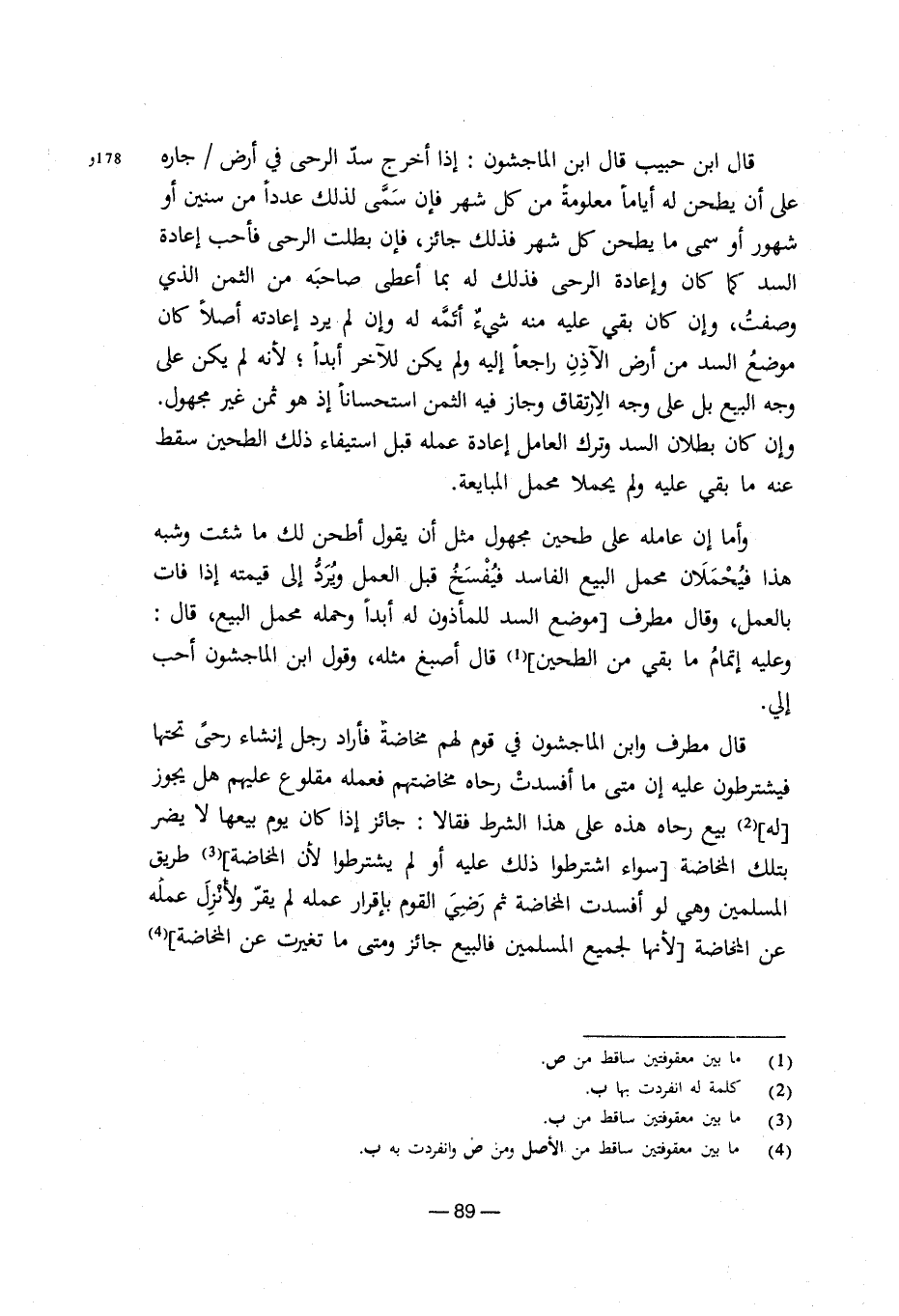 قال ابن حبيب قال ابن الماجشون: إذا أخرج سد الرحى في أرض/ جاره على أن يطحن له أياماً معلومةً من كل شهر فإن سمى لذلك عدداً من سنين أو شهور أو سمى ما يطحن كل شهر فذلك جائز، فإن بطلت الرحى فأحب إعادة السد كما كان وإعادة الرحى فذلك له بما أعطى صاحبه من الثمن الذي وصفتُ، وإن كان بقي عليه منه شيءٌ أتمه له وإن لم يرد إعادته أصلاً كان موضعُ السد من أرض الآذن راجعاً إليه ولم يكن للآخر أبداً، لأنه لم يكن على وجه البيع بل على وجه الارتقاق وجاز فيه الثمن استحساناً إذ هو ثمن غير مجهول. وإن كان بطلان السد وترك العامل إعادة عمله قبل استيفاء ذلك الطحين سقط عنه ما بقي عليه ولم يحملا محمل المبايعة.
