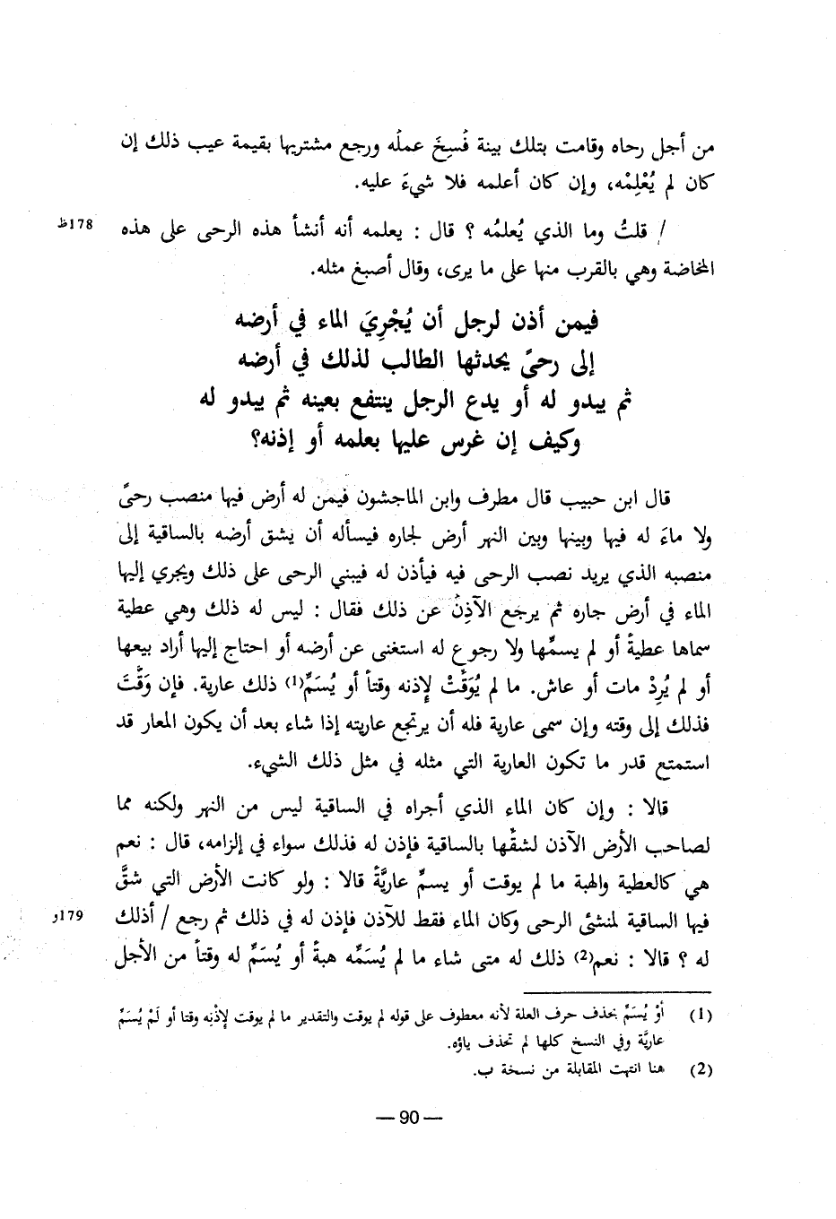 قالا: وإن كان الماء الذي أجراه في الساقية ليس من النهر ولكنه مما لصاحب الأرض الآذن لشقها بالساقية فإذن له فذلك سواء في إلزامه، قال: نعم هي كالعطية والهبة ما لم يوقت أو يسمِّ عارية قالا: ولو كانت الأرض التي شق فيها الساقية لمنشئ الرحى وكان الماء فقط للآذن فإذن له في ذلك ثم رجع/ أذلك له؟ قالا: نعم (¬2) ذلك له متى شاء ما لم يُسمه هبةً أو يُسمِّ له وقتاً من الأجل ¬__________