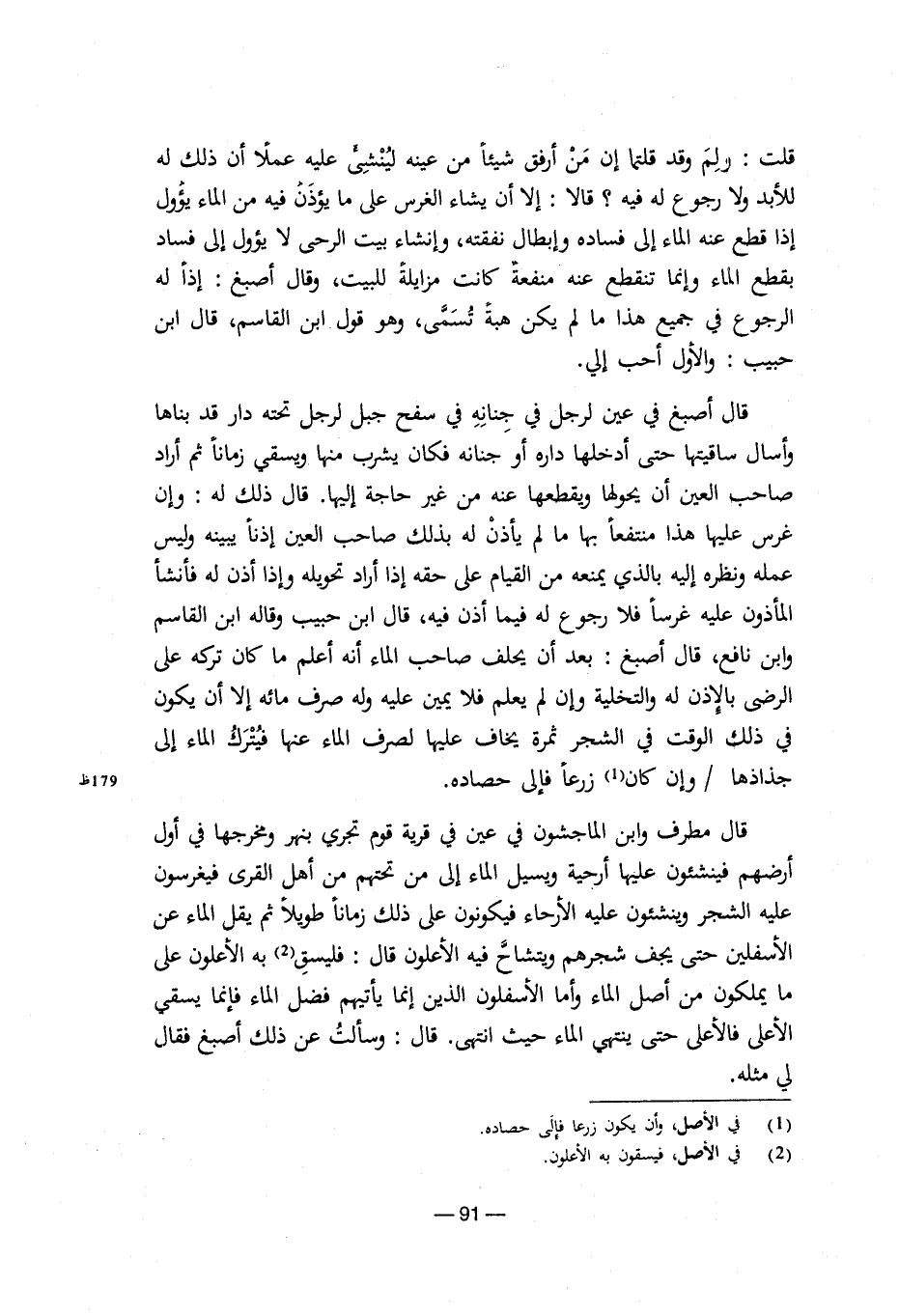 قال مطرف وابن الماجشون في عين في قرية قوم تجري بنهر ومخرجها في أول أرضهم فينشئون عليها أرحية ويسيل الماء إلى من تحتهم من أهل القرى فيغرسون عليه الشجر وينشئون عليه الأرحاء فيكونون على ذلك زماناً طويلاً ثم يقل الماء عن الأسفلين حتى يجف شجرهم ويتساح فيه الأعلون قال: فليسق (¬2) به الأعلون على ما يملكون من أصل الماء وأما الأسفلون الذين إنما يأتيهم فضل الماء فإنما يسقي الأعلى فالأعلى حتى ينتهي الماء حيث انتهى. قال: وسألتُ عن ذلك أصبغ فقال لي مثله.