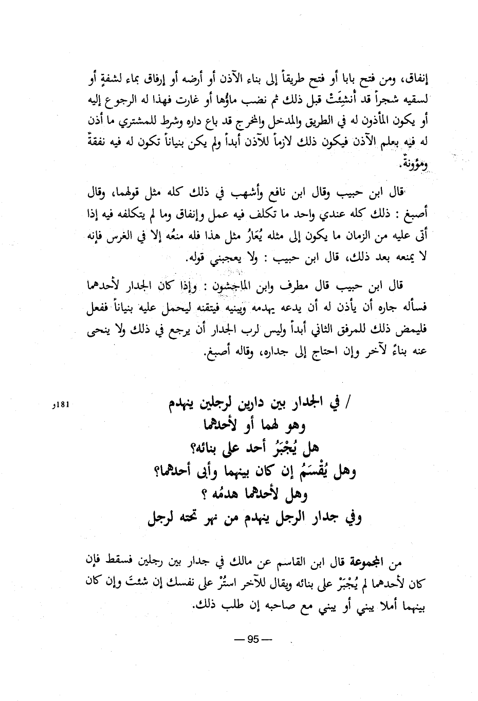 من المجموعة قال ابن القاسم عن مالك في جدار بين رجلين فسقط فإن كان لأحدهما لم يُجبر على بنائه ويقال للآخر استُر على نفسك إن شئت وإن كان بينهما أملاً يبني أو يبني مع صاحبه إن طلب ذلك.