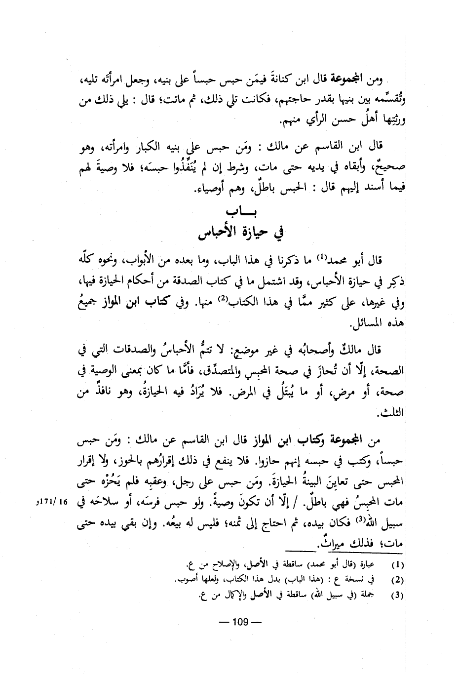ومن المجموعة قال ابن كنانة فيمن حبس حبسا على بنيه، وجعل امرأته تليه، وتقسمه بين بنيها بقدر حاجتهم، فكانت تلي ذلك، ثم ماتت؛ قال: يلي ذلك من ورثتها أهل حسن الرأي منهم. قال ابن القاسم عن مالك: ومن حبس على بنيه الكبار وامرأته، وهو صحيح، وأبقاه في يديه حتى مات، وشرط إن لم يُنَفَّذُوا حبسه؛ فلا وصية لهم فيما أسند إليهم قال: الحبس باطل، وهم أوصياء. باب في حيازة الأحباس قال أبو محمد (¬1) ما ذكرنا في هذا الباب، وما بعده من الأبواب، ونحوه كله ذكر في حيازة الأحباس، وقد اشتمل ما في كتاب الصدقة من أحكام الحيازة فيها، وفي غيرها، على كثير مما في هذا الكتاب (¬2) منها. وفي كتاب ابن المواز جميع هذه المسائل. قال مالك وأصحابه في غير موضع: لا تتم الأحباس والصدقات التي في الصحة، إلا أن تحاز في صحة المحبس والمتصدق، فأما ما كان بمعنى الوصية في صحة، أو مرض، أو ما يُبتَلُ في المرض. فلا يُرَادُ فيه الحيازة، وهو نافذ من الثلث. من المجموعة وكتاب ابن المواز قال ابن القاسم عن مالك: ومن حبس حبسا، وكتب في حبسه إنهم حازوا. فلا ينفع في ذلك إقرارهم بالحوز، ولا إقرار المحبس حتى تعاين البينة الحيازة. ومن حبس على رجل، وعقبه فلم يَحُزْه حتى مات المحبس فهي باطل./ إلا أن تكون وصية. ولو حبس فرسه، أو سلاحه في سبيل الله (¬3) فكان بيده، ثم احتاج إلى ثمنه؛ فليس له بيعه. وإن بقي بيده حتى مات؛ فذلك ميراث.