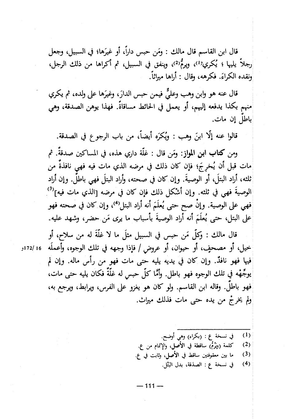 قال ابن القاسم قال مالك: ومن حبس دارا، أو غيرها؛ في السبيل، وجعل رجلا يليها؛ يُكري (¬1) ويرم (¬2)، وينفق في السبيل، ثم أكراها من ذلك الرجل، ونقده الكراء. فكرهه، وقال: أراها ميراثا. قال عنه هو وابن وهب وعلي فيمن حبس الدار، وغيرها على ولده، ثم يكري منهم بكذا يدفعه إليهم، أو يعمل في الحائط مساقاة. فهذا يوهن الصدقة، وهي باطل إن مات. قالوا عنه إلا ابن وهب: ويُكَره أيضا، من باب الرجوع في الصدقة. ومن كتاب ابن المواز: ومن قال: غلة داري هذه، في المساكين صدقة. ثم مات قبل أن يُخرِجَ؛ فإن كان ذلك في مرضه الذي مات فيه فهي نافذة من ثلثه، أراد البتل، أو الوصية. وإن كان في صحته، وأراد البتل فهي باطل. وإن أراد الوصية فهي في ثلثه. وإن أشكل ذلك فإن كان في مرضه [الذي مات فيه] (¬3) فهي على الوصية. وإن صح حتى يُعلَمَ أنه أراد البتل (¬4)، وإن كان في صحته فهو على البتل، حتى يعلم أنه أراد الوصية بأسباب ما يرى من حضر، وشهد عليه. قال مالك: وكل من حبس في السبيل مثل ما لا غلة له من سلاح، أو خيل، أو مصحف، أو حيوان، أو عروض/ فإذا وجهه في تلك الوجوه، وأعمله فيها فهو نافد. وإن كان في يديه يليه حتى مات فهو من رأس ماله. وإن لم يوجهه في تلك الوجوه فهو باطل. وأما كل حبس له غلة فكان يليه حتى مات، فهو باطل. وقاله ابن القاسم. ولو كان هو يغزو على الفرس، ويرابط، ويرجع به، ولم يخرج من يده حتى مات فذلك ميراث.