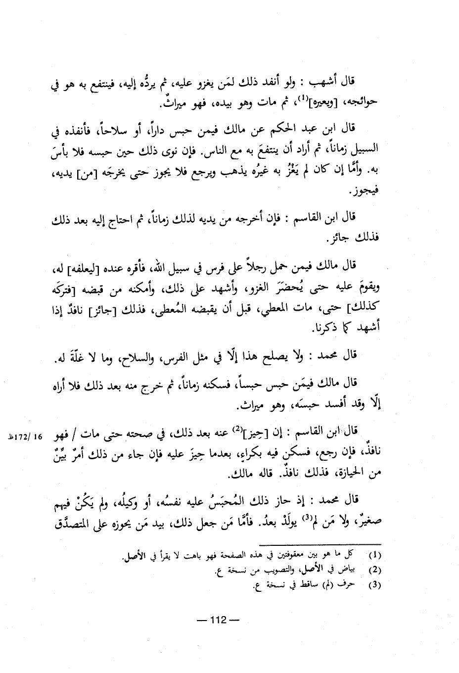 قال أشهب: ولو أنفد ذلك لمن يغزو عليه، ثم يرده إليه، فينتفع به هو في حوائجه، [ويعيره] (¬1)، ثم مات وهو بيده، فهو ميراث. قال ابن عبد الحكم عن مالك فيمن حبس دارا، أو سلاحا، فأنفذه في السبيل زمانا، ثم أراد أن ينتفع به مع الناس. فإن نوى ذلك حين حبسه فلا بأس به. وأما إن كان لم يَغْزُ به غيره يذهب ويرجع فلا يجوز حتى يخرجه [من] يديه، فيجوز. قال ابن القاسم: فإن أخرجه من يديه لذلك زمانا، ثم احتاج إليه بعد ذلك فذلك جائز. قال مالك فيمن حمل رجلا على فرس في سبيل الله، فأقره عنده [ليعلفه] له، ويقوم عليه حتى يحضر الغزو، وأشهد على ذلك، وأمكنه من قبضه [فتركه كذلك] حتى، مات المعطي، قبل أن يقبضه المعطى، فذلك [جائز] نافد إذا أشهد كما ذكرنا. قال محمد: ولا يصلح هذا إلا في مثل الفرس، والسلاح، وما لا غلة له. قال مالك فيمن حبس حبسا، فسكنه زمانا، ثم خرج منه بعد ذلك فلا أراه إلا وقد أفسد حبسه، وهو ميراث. قال ابن القاسم: إن [حيز] (¬2) عنه بعد ذلك، في صحته حتى مات/ فهو نافذ، فإن رجع، فسكن فيه بكراء، بعدما حيز عليه فإن جاء من ذلك أمر بين من الحيازة، فذلك نافذ. قاله مالك. قال محمد: إذ حاز ذلك المُحبَسُ عليه نفسه، أو وكيله، ولم يَكُنْ فيهم صغير، ولا من لم (¬3) يولد بعد. فأما من جعل ذلك، بيد من يحوزه على المتصدق