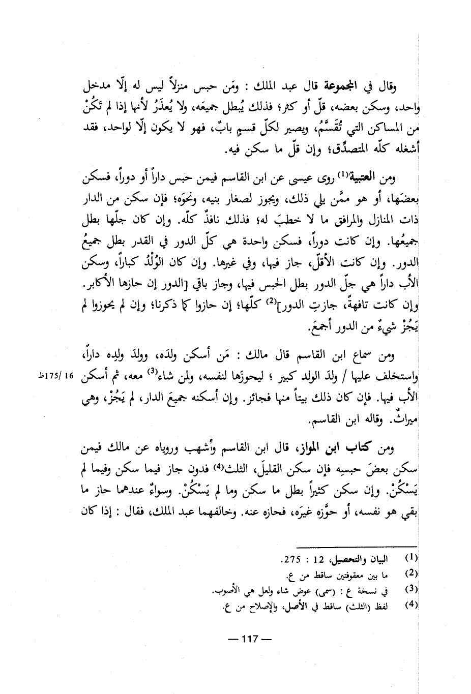 وقال في المجموعة قال عبد الملك: ومن حبس منزلا ليس له إلا مدخل واحد، وسكن بعضه، قل أو كثر؛ فذلك يبطل جميعه، ولا يُعذَرُ لأنها إذا لم تكن من المساكن التي تُقَسَّمُ، ويصير لكل قسم باب، فهو لا يكون إلا لواحد، فقد أشغله كله المتصدق؛ وإن قل ما سكن فيه. ومن العتبية (¬3) روى عيسى عن ابن القاسم فيمن حبس دارا أو دورا، فسكن بعضها، أو هو ممن يلي ذلك، ويجوز لصغار بنيه، ونحوه؛ فإن سكن من الدار ذات المنازل والمرافق ما لا خطب له؛ فذلك نافذ كله. وإن كان جلها بطل جميعها. وإن كانت دورا، فسكن واحدة هي كل الدور في القدر بطل جميع الدور. وإن كانت الأقل، جاز فيها، وفي غيرها. وإن كان الوُلْدُ كبارا، وسكن الأب دارا هي جل الدور بطل الحبس فيها، وجاز باقي [الدور إن حازها الأكابر. وإن كانت تافهة، جازت الدور] (¬4) كلها؛ إن حازوا كما ذكرنا؛ وإن لم يحوزوا لم يَجُزْ شيء من الدور أجمع. ومن سماع ابن القاسم قال مالك: من أسكن ولده، وولد ولده دارا، واستخلف عليها/ ولد الولد كبير؛ ليحوزها لنفسه، ولمن شاء (¬5) معه، ثم أسكن الأب فيها. فإن كان ذلك بيتا منها فجائز. وإن أسكنه جميع الدار، لم يَجُزْ، وهي ميراث. وقاله ابن القاسم. ومن كتاب ابن المواز، قال ابن القاسم وأشهب وروياه عن مالك فيمن سكن بعض حبسه فإن سكن القليل، الثلث (¬6) فدون جاز فيما سكن وفيما لم يَسْكُنْ. وإن سكن كثيرا بطل ما سكن وما لم يَسْكُنْ. وسواء عندهما حاز ما بقي هو نفسه، أو حوزه غيره، فحازه عنه. وخالفهما عبد الملك، فقال: إذا كان