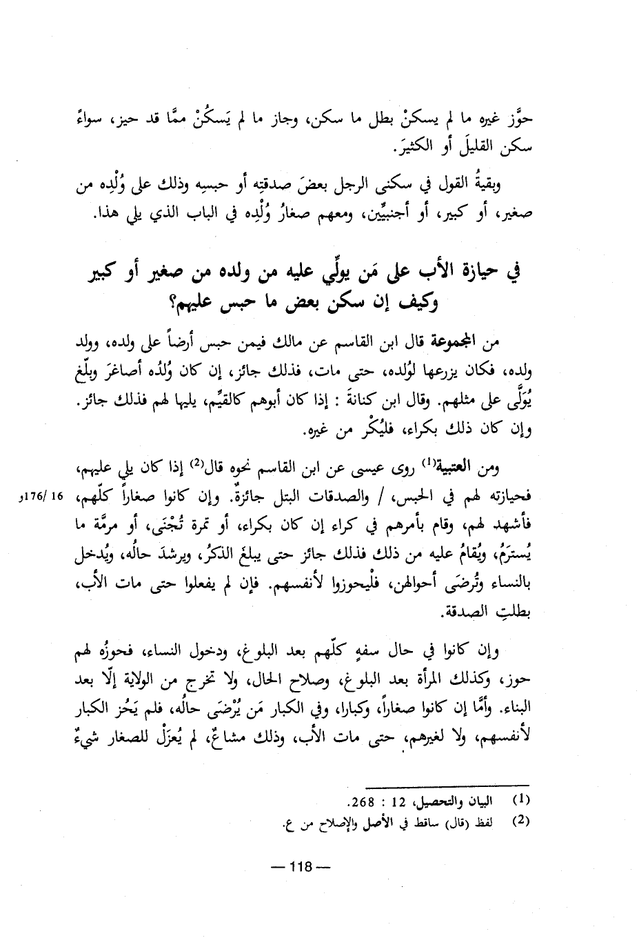 حوز غيره ما لم يسكن بطل ما سكن، وجاز ما لم يَسكُنْ مما قد حيز، سواء سكن القليل أو الكثير. وبقية القول في سكنى الرجل بعض صدقته أو حبسه وذلك على وُلْدِه من صغير، أو كبير، أو أجنبيين، ومعهم صغار وُلْدِه في الباب الذي يلي هذا. في حيازة الأب على من يولي عليه من ولده من صغير أو كبير وكيف إن سكن بعض ما حبس عليهم؟ من المجموعة قال ابن القاسم عن مالك فيمن حبس أرضا على ولده، وولد ولده، فكان يزرعها لولده، حتى مات، فذلك جائز، إن كان ولده أصاغر وبلغ يُوَلَّى على مثلهم. وقال ابن كنانة: إذا كان أبوهم كالقيم، يليها لهم فذلك جائز. وإن كان ذلك بكراء، فليُكْر من غيره. ومن العتبية (¬1) روى عيسى عن ابن القاسم نحوه قال (¬2) إذا كان يلي عليهم، فحيازته لهم في الحبس،/ والصدقات البتل جائزة. وإن كانوا صغارا كلهم، فأشهد لهم، وقام بأمرهم في كراء إن كان بكراء، أو تمرة تُجْنَى، أو مرمة ما يُسترَمُ، ويُقامُ عليه من ذلك فذلك جائز حتى يبلغ الذكر، ويرشد حاله، ويدخل بالنساء وترضى أحوالهن، فليحوزوا لأنفسهم. فإن لم يفعلوا حتى مات الأب، بطلت الصدقة. وإن كانوا في حال سفة كلهم بعد البلوغ، ودخول النساء، فحوزة لهم حوز، وكذلك المرأة بعد البلوغ، وصلاح الحال، ولا تخرج من الولاية إلا بعد البناء. وأما إن كانوا صغارا، وكبارا، وفي الكبار من يُرْضَى حاله، فلم يحز الكبار لأنفسهم، ولا لغيرهم، حتى مات الأب، وذلك مشاع، لم يُعزَلْ للصغار شيء