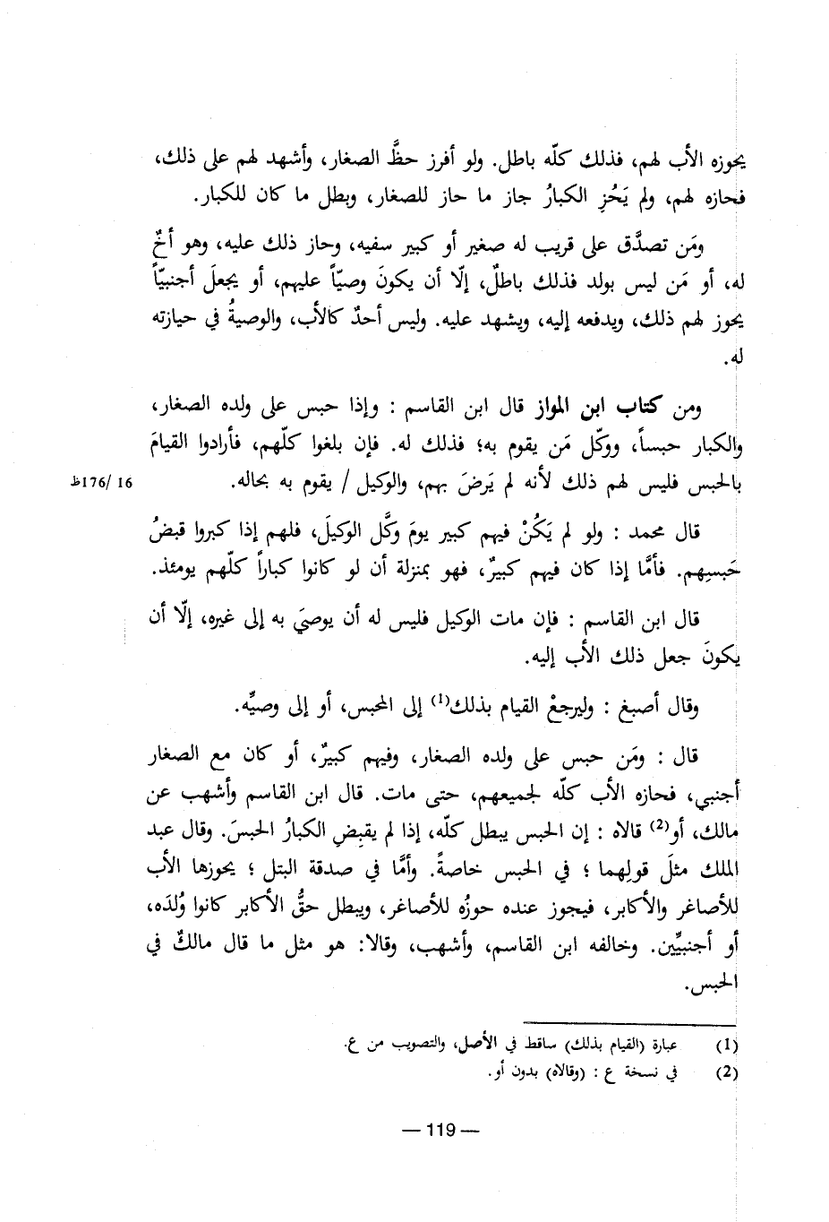 يحوزه الأب لهم، فذلك كله باطل. ولو أفرز حظ الصغار، وأشهد لهم على ذلك، فحازه لهم، ولم يَحُزِ الكبار جاز ما حاز للصغار، وبطل ما كان للكبار. ومن تصدق على قريب له صغير أو كبير سفيه، وحاز ذلك عليه، وهو أخ له، أو من ليس بولد فذلك باطل، إلا أن يكون وصيا عليهم، أو يجعل أجنبيا يحوز لهم ذلك، ويدفعه إليه، ويشهد عليه. وليس أحد كالأب، والوصية في حيازته له. ومن كتاب ابن المواز قال ابن القاسم: وإذا حبس على ولده الصغار، والكبار حبسا، ووكل من يقوم به؛ فذلك له. فإن بلغوا كلهم، فأرادوا القيام بالحبس فليس لهم ذلك لأنه لم يرض بهم، والوكيل/ يقوم به بحاله. قال محمد: ولو لم يَكُنْ فيهم كبير يوم وكل الوكيل، فلهم إذا كبروا قبض حبسهم. فأما إذا كان فيهم كبير، فهو بمنزلة أن لو كانوا كبارا كلهم يومئذ. قال ابن القاسم: فإن مات الوكيل فليس له أن يوصي به إلى غيره، إلا أن يكون جعل ذلك الأب إليه. وقال أصبغ: وليرجع القيام بذلك (¬1) إلى المحبس، أو إلى وصية. قال: ومن حبس على ولده الصغار، وفيهم كبير، أو كان مع الصغار أجنبي، فحازه الأب كله لجميعهم، حتى مات. قال ابن القاسم وأشهب عن مالك، أو (¬2) قالاه: إن الحبس يبطل كله، إذا لم يقبض الكبار الحبس. وقال عبد الملك مثل قولهما؛ في الحبس خاصة. وأما في صدقة البتل؛ يحوزها الأب للأصاغر والأكابر، فيجوز عنده حوزه للأصاغر، ويبطل حق الأكابر كانوا ولده، أو أجنبيين. وخالفه ابن القاسم، وأشهب، وقالا: هو مثل ما قال مالك في الحبس.