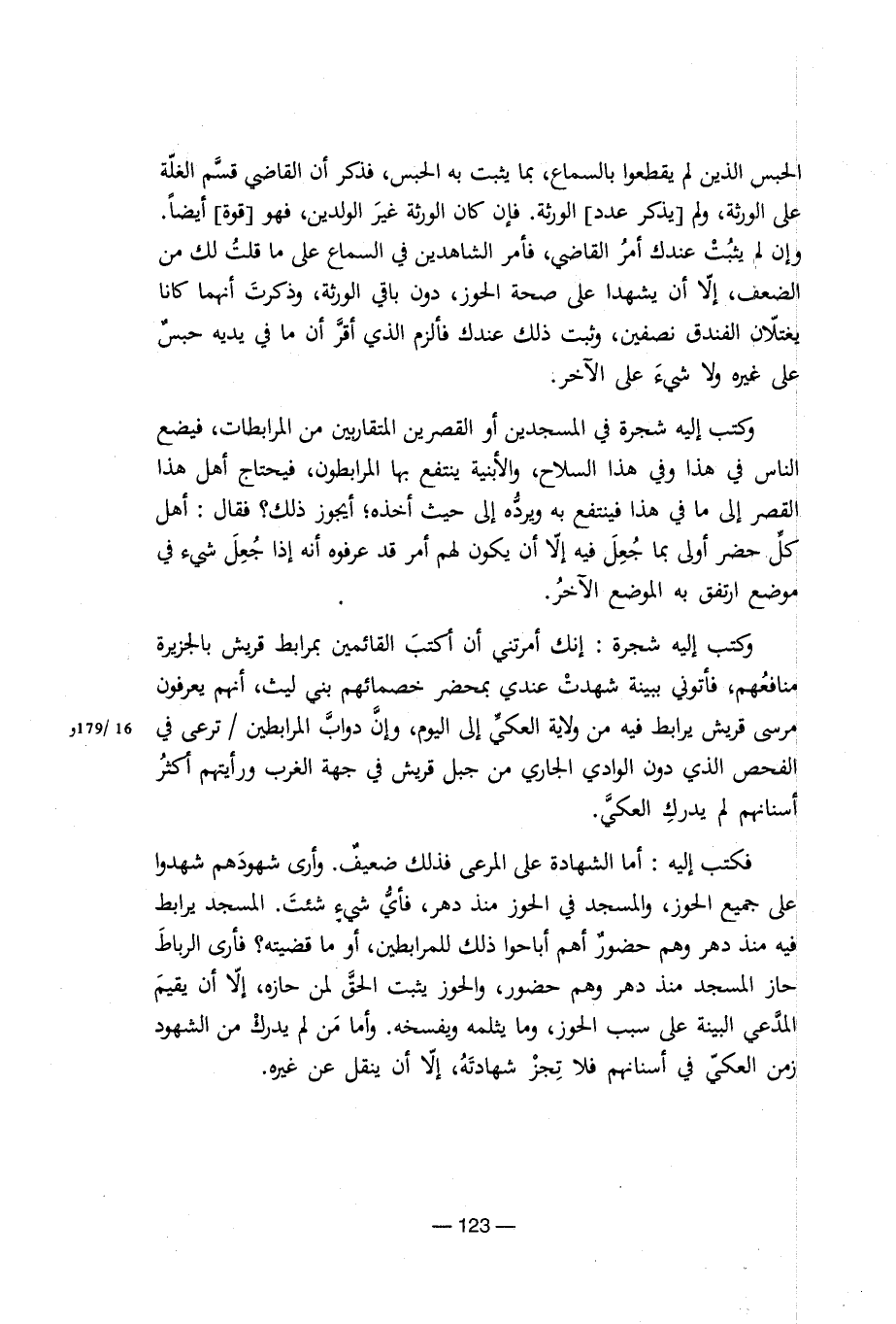 الحبس الذين لم يقطعوا بالسماع، بما يثبت به الحبس، فذكر أن القاضي قسم الغلة على الورثة، ولم [يذكر عدد] الورثة. فإن كان الورثة غير الولدين، فهو [قوة] أيضا. وإن لم يثبت عندك أمر القاضي، فأمر الشاهدين في السماع على ما قلت لك من الضعف، إلا أ، يشهدا على صحة الحوز، دون باقي الورثة، وذكرت أنهما كانا يغتلان الفندق نصفين، وثبت ذلك عندك فألزم الذي أقر أن ما في يديه حبس على غيره ولا شيء على الآخر. وكتب إليه شجرة في المسجدين أو القصرين المتقاربين من المرابطات، فيضع الناس في هذا وفي هذا السلاح، والأبنية ينتفع بها المرابطون، فيحتاج أهل هذا القصر إلى ما في هذا فينتفع به ويرده إلى حيث أخذه؛ أيجوز ذلك؟ فقال: أهل كل حضر أولى بما جعل فيه إلا أن يكون لهم أمر قد عرفوه أنه إذا جُعِلَ شيء في موضع ارتفق به الموضع الآخر. وكتب إليه شجرة: إنك أمرتني أن أكتب القائمين بمرابط قريش بالجزيرة منافعهم، فأتوني ببينة شهدت عندي بمحضر خصمائهم بني ليث، أنهم يعرفون مرسى قريش يرابط فيه من ولاية العكي إلى اليوم، وإن دواب المرابطين/ ترعى في الفحص الذي دون الوادي الجاري من جبل قريش في جهة الغرب ورأيتهم أكثر أسنانهم لم يدرك العكي. فكتب إليه: أما الشهادة على المرعى فذلك ضعيف. وأرى شهودهم شهدوا على جميع الحوز، والمسجد في الحوز منذ دهر، فأي شيء شئت. المسجد يرابط فيه منذ دهر وهم حضور أهم أباحوا ذلك للمرابطين، أو ما قضيته؟ فأرى الرباط حاز المسجد منذ دهر وهم حضور، والحوز يثبت الحق لمن حازه، إلا أن يقيم المدعي البينة على سبب الحوز، وما يثلمه ويفسخه. وأما من لم يدرك من الشهود زمن العكي في أسنانهم فلا تجز شهادته، إلا أن ينقل عن غيره.
