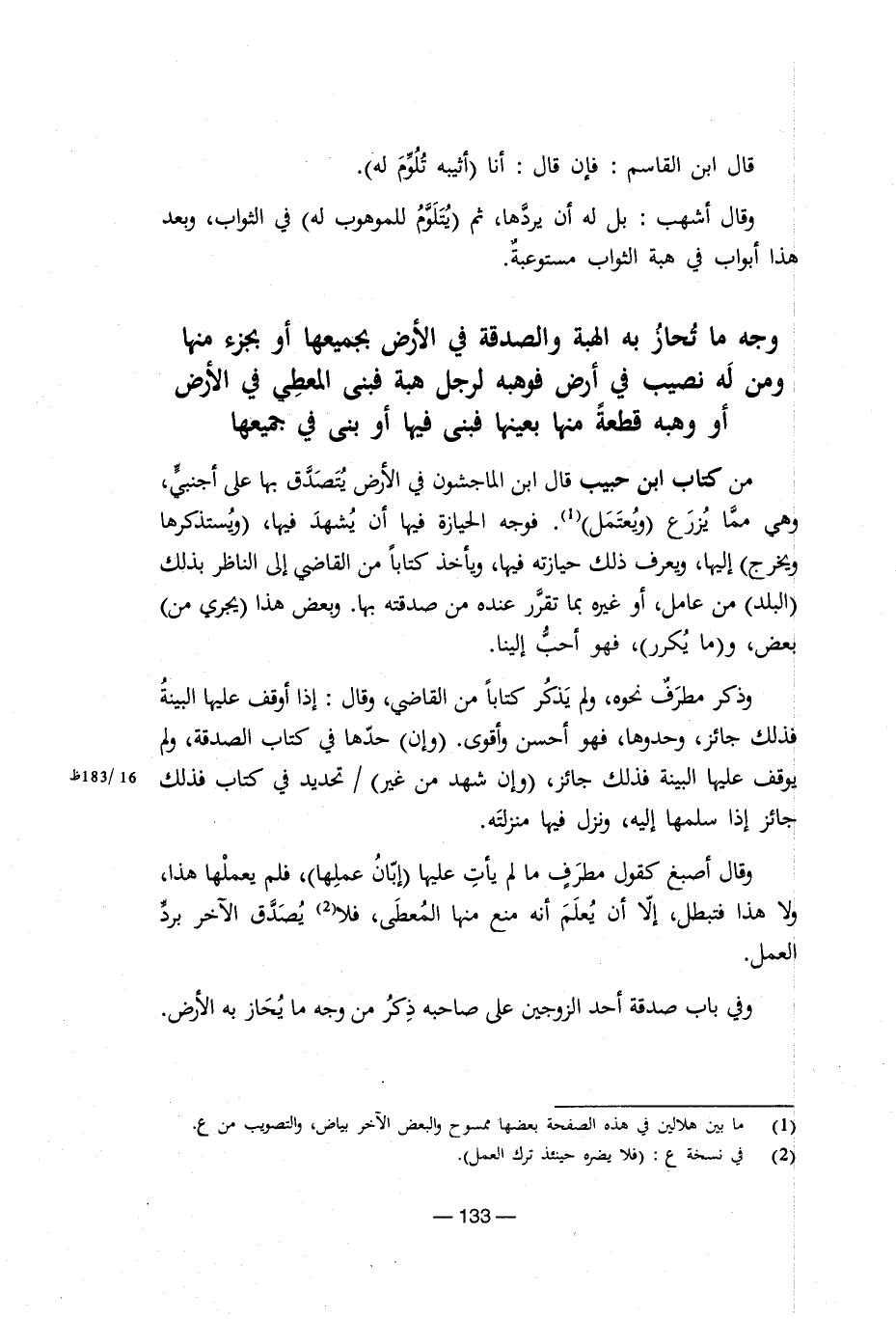 قال ابن القاسم: فإن قال: أنا (أثيبه تُلُوَّمَ له). وقال أشهب: بل له أن يردها، ثم (يُتَلَوَّمُ للموهوب له) في الثواب، وبعد هذا أبواب في هبة الثواب مستوعبة. وجه ما تحاز به الهبة والصدقة في الأرض بجميعها أو بجزء منها ومن له نصيب في ارض فوهبه لرجل هبة فبنى المعطي في الأرض أو وهبه قطعة منها بعينها فبنى فيها أو بنى في جميعها من كتاب ابن حبيب قال ابن الماجشون في الأرض يتصدق بها على أجنبي، وهي مما يزرع (ويعتمل) (¬1). فوجه الحيازة فيها أن يشهد فيها، (ويستذكرها ويخرج) إليها، ويعرف ذلك حيازته فيها، ويأخذ كتابا من القاضي إلى الناظر بذلك (البلد) من عامل، أو غيره بما تقرر عنده من صدقته بها. وبعض هذا (يجري من) بعض، و (ما يكرر)، فهو أحب إلينا. وذكر مطرف نحوه، ولم يذكر كتابا من القاضي، وقال: إذا أوقف عليها البينة فذلك جائز، وحدوها، فهو أحسن وأقوى. (وإن) حدها في كتاب الصدقة، ولم يوقف عليها البينة فذلك جائز، (وإن شهد من غير) / تحديد في كتاب فذلك جائز إذا سلمها إليه، ونزل فيها منزلته. وقال أصبغ كقول مطرف ما لم يأت عليها (إبان عملها)، فلم يعملها هذا، ولا هذا فتبطل، إلا أن يُعلَمَ أنه منع منها المعطى، فلا (¬2) يصدق الآخر برد العمل. وفي باب صدقة أحد الزوجين على صاحبه ذكر من وجه ما يحاز به الأرض.