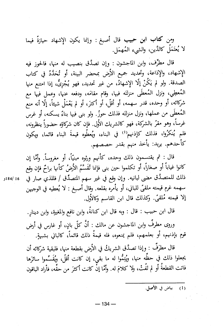 ومن كتاب ابن حبيب قال أصبغ: وإنما يكون الإشهاد حيازة فيما لا يُعتَمَلُ كالدين، والشيء المهمل. قال مطرف، وابن الماجشون: وإن تصدق بنصيب له منها، فالحوز فيه الإشهاد، والإذاعة، وتحديد جميع الأرض بمحضر البينة، او تُحَدَّدُ في كتاب الصدقة. ولو لم يَكُنْ إلا الإشهاد، من غير تحديد، فهو يُجْزِى، إذا امتنع منها المُعطي، ونزل المعطى منزلته فيها، وقام مقامه، ودفعه عنها، وعمل فيها مع شركائه، أو وحده، قدر سهمه، أو أقل، أو اكثر، أو لم يَعْمَلْ شيئا، إلا أنه منع المعطى من عملها، ونزل منزلته فذلك حوز. ولو بنى فيها بناء يسكنه، أو غرس غرسا، وهو مقر بالشركة، فهو كالشريك الأول. فإن كان شركاؤه حضورا ينظرونه، فلم يُنكرُوا، فذلك كإذنهم (¬1) في البناء، ويعطوه قيمة البناء قائما، ويكون كأحدهم. يريد: يأخذ منهم بقدر حصصهم. قال: ثم يقتسمون ذلك وحده، كأنهم ورثوه مبنيا، أو مغروسا. وأما إن كانوا غيابا أو صغارا، أو تكلموا حين بنى فإنما تُقَسَّمُ الأرض كأنها براح فإن وقع ذلك للمتصدق مضى لبانيه. وإن وقع في غير سهم المتصدق/ فللذي صار في سهمه غرم قيمته ملقى للباني، أو يأمره بقلعه. وقال أصبغ: لا يعطيه في الوجيهن إلا قيمته ملقى. وكذلك قال ابن القاسم وكالأول. قال ابن حبيب: قال: وبه قال ابن كنانة، وابن نافع والمغيرة، وابن دينار. وروى مطرف وابن الماجشون عن مالك: أن كل بان، أو غارس في أرض قوم بإذنهم، أو بعلمهم، فلم يمنعوه، فله قيمة ذلك قائما، كالباني بشبهة. قال مطرف: وإذا تصدق الشريك في الأرض بقطعة منها، فلبقية شركائه أن يجعلوا ذلك في حظه منها، ويُتِمُّوا له ما بقي، إن كانت أقل، ويُقَسَّموا سائرها فاتت القطعة أو لم تفت، ولا كلام له. وأما إن كانت أكثر من حقه، فأراد الباقون
