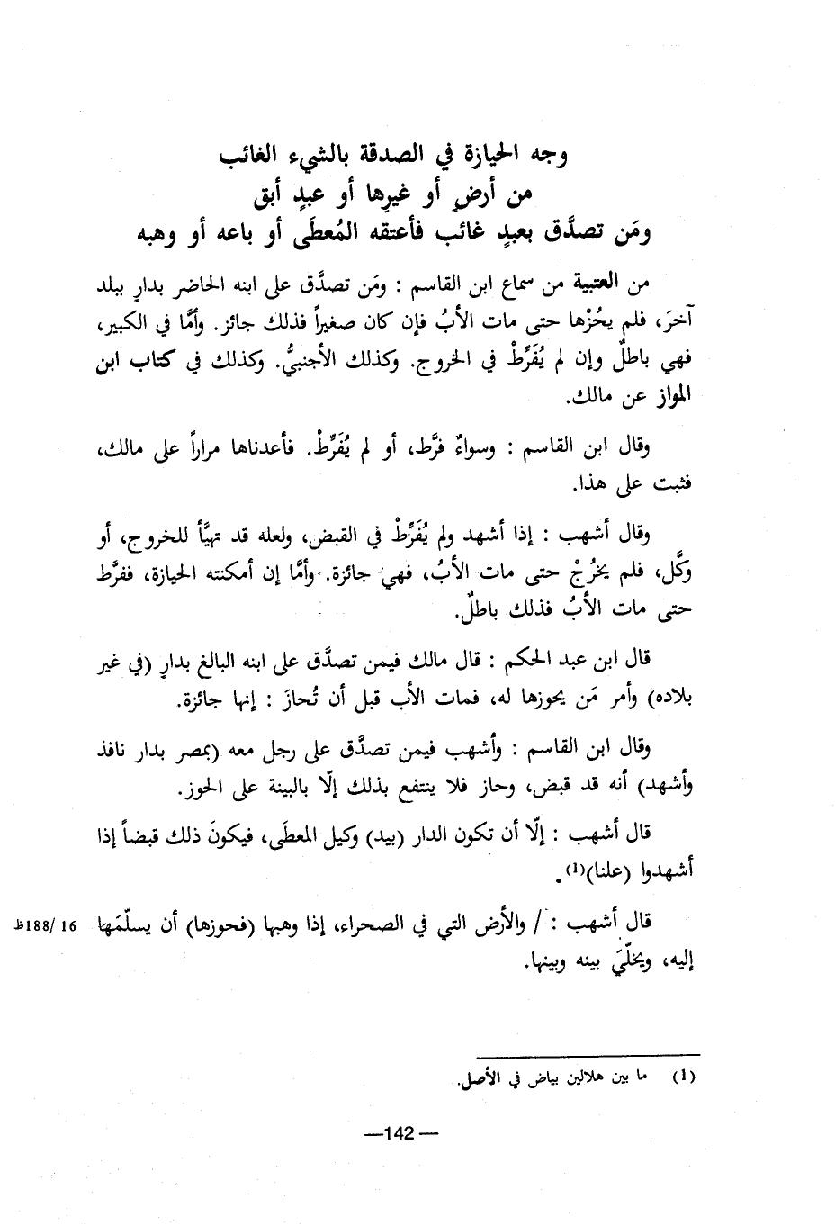 وجه الحيازة في الصدقة بالشيء الغائب من أرض أو غيرها أو عبد أبق ومن تصدق بعبد غائب فأعتقه المعطى أو باعه أو وهبه من التبية من سماع ابن القاسم: ومن تصدق على ابنه الحاضر بدار ببلد آخر، فلم يحزها حتى مات الأب فإن كان صغيرا فذلك جائز. وأما في الكبير، فهي باطل وإن لم يُفَرَّطْ في الخروج. وكذلك الأجنبي. وكذلك في كتاب ابن المواز عن مالك. وقال ابن القاسم: وسواء فرط، أو لم يُفَرَّطْ. فأعدناها مرارا على مالك، فثبت على هذا. وقال أشهب: إذا أشهد ولم يُفَرَّطْ في القبض، ولعله قد تهيأ للخروج، أو وكل، فلم يخرج حتى مات الأب، فهي جائزة. وأما إن أمكنته الحيازة، ففرط حتى مات الأب فذلك باطل. قال ابن عبد الحكم: قال مالك فيمن تصدق على ابنه البالغ بدار (في غير بلاده) وأمر من يحوزها له، فمات الأب قبل أن تحاز: إنها جائزة. وقال ابن القاسم: وأشهب فيمن تصدق على رجل معه (بمصر بدار نافذ وأشهد) أنه قد قبض، وحاز فلا ينتفع بذلك إلا بالبينة على الحوز. قال أشهب: إلا أن تكون الدار (بيد) وكيل المعطى، فيكون ذلك قبضا إذا أشهدوا (علنا) (¬1). قال أشهب:/ والأرض التي في الصحراء، إذا وهبها (فحوزها) أن يسلمها إليه، ويخلي بينه وبينها.