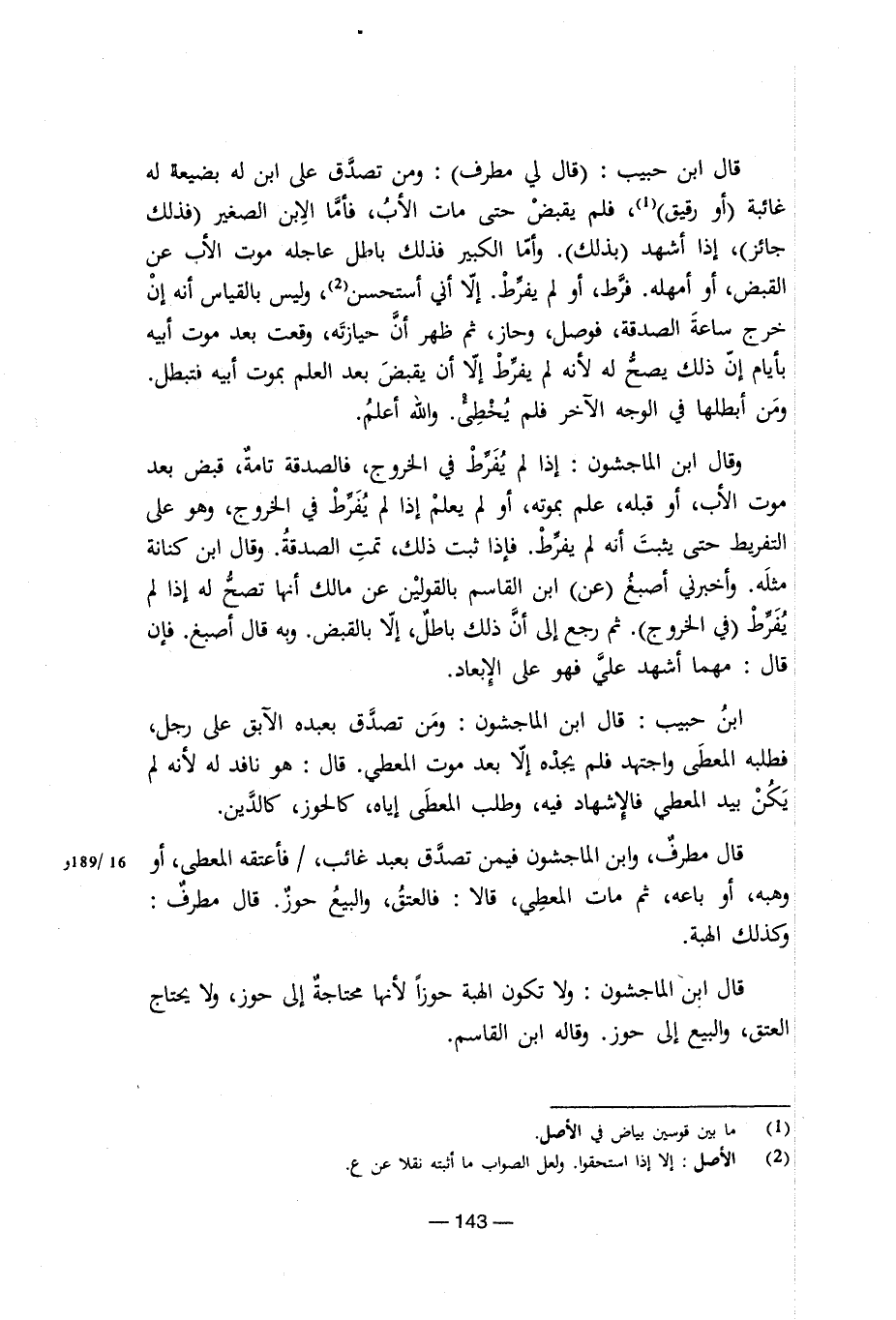 قال ابن حبيب: (قال لي مطرف): ومن تصدق على ابن له بضيعة له غائبة (أو رقيق) (¬1)، فلم يقبض حتى مات الأب، فأما الابن الصغير (فذلك جائز)، إذا أشهد (بذلك). وأما الكبير فذلك باطل عاجله موت الأب عن القبض، أو أمهله. فرط، أو لم يفرط. إلا أني أستحسن (¬2)، وليس بالقياس أنه إن خرج ساعة الصدقة، فوصل، وحاز، ثم ظهر أن حيازته، وقعت بعد موت أبيه بأيام إن ذلك يصح له لأنه لم يفرط إلا أن يقبض بعد العلم بموت أبيه فتبطل. ومن أبطلها في الوجه الآخر فلم يُخْطِىْ. والله أعلم. وقال ابن الماجشون: إذا لم يفرط في الخروج، فالصدقة تامة، قبض بعد موت الأب، أو قبله، علم بموته، أو لم يعلم إذا لم يفرط في الخروج، وهو على التفريط حتى يثبت أنه لم يفرط. فإذا ثبت ذلك، تمت الصدقة. وقال ابن كنانة مثله. وأخبرني أصبغ (عن) ابن القاسم بالقولين عن مالك أنها تصح له إذا لم يفرط (في الخروج). ثم رجع إلى أن ذلك باطل، إلا بالقبض. وبه قال أصبغ. فإن قال: مهما أشهد علي فهو على الإبعاد. ابن حبيب: قال ابن الماجشون: ومن تصدق بعبده الآبق على رجل، فطلبه المعطى واجتهد فلم يجده إلا بعد موت المعطي. قال: هو نافد له لأنه لم يكن بيد المعطي فالإشهاد فيه، وطلب المعطى إياه، كالحوز، كالدين. قال مطرف، وابن الماجشون فيمن تصدق بعبد غائب،/ فأعتقه المعطى، أو وهبه، أو باعه، ثم مات المعطي، قالا: فالعتق، والبيع حوز. قال مطرف: وكذلك الهبة. قال ابن الماجشون: ولا تكون الهبة حوزا لأنها محتاجة إلى حوز، ولا يحتاج العتق، والبيع إلى حوز. وقاله ابن القاسم.