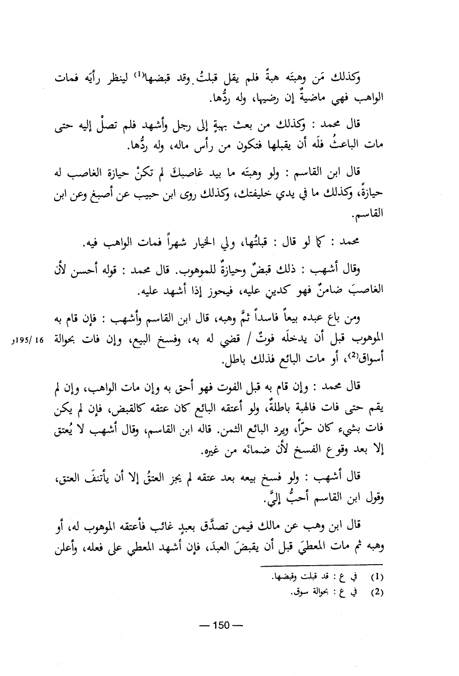 وكذلك من وهبته هبة فلم يقل قبلت. وقد قبضها (¬1) لينظر رأيه فمات الواهب فهي ماضية إن رضيها، وله ردها. قال محمد: وكذلك من بعث بهبة إلى رجل وأشهد فلم تصل إليه حتى مات الباعث فله أن يقبلها فتكون من رأس ماله، وله ردها. قال ابن القاسم: ولو وهبته ما بيد غاصبك لم تكن حيازة الغاصب له حيازة، وكذلك ما في يدي خليفتك، وكذلك روى ابن حبيب عن أصبغ وعن ابن القاسم. محمد: كما لو قال: قبلتُها، ولي الخيار شهرا فمات الواهب فيه. وقال أشهب: ذلك قبض وحيازة للموهوب. قال محمد: قوله أحسن لأن الغاصب ضامن فهو كدين عليه، فيحوز إذا أشهد عليه. ومن باع عبده بيعا فاسدا ثم وهبه، قال ابن القاسم وأشهب: فإن قام به الموهوب قبل أن يدخله فوت/ قضي له به، وفسخ البيع، وإن فات بحوالة أسواق (¬2)، أو مات البائع فذلك باطل. قال محمد: وإن قام به قبل الفوت فهو أحق به وإن مات الواهب، وإن لم يقم حتى فات فالهبة باطلة، ولو أعتقه البائع كان عتقه كالقبض، فإن لم يكن فات بشيء كان حرا، ويرد البائع الثمن. قاله ابن القاسم، وقال أشهب لا يعتق إلا بعد وقوع الفسخ لأن ضمانه من غيره. قال أشهب: ولو فسخ بيعه بعد عتقه لم يجز العتق إلا أن يأتنف العتق، وقول ابن القاسم أحب إلي. قال ابن وهب عن مالك فيمن تصدق بعبد غائب فأعتقه الموهوب له، أو وهبه ثم مات المعطي قبل أن يقبض العبد، فإن أشهد المعطي على فعله، وأعلن