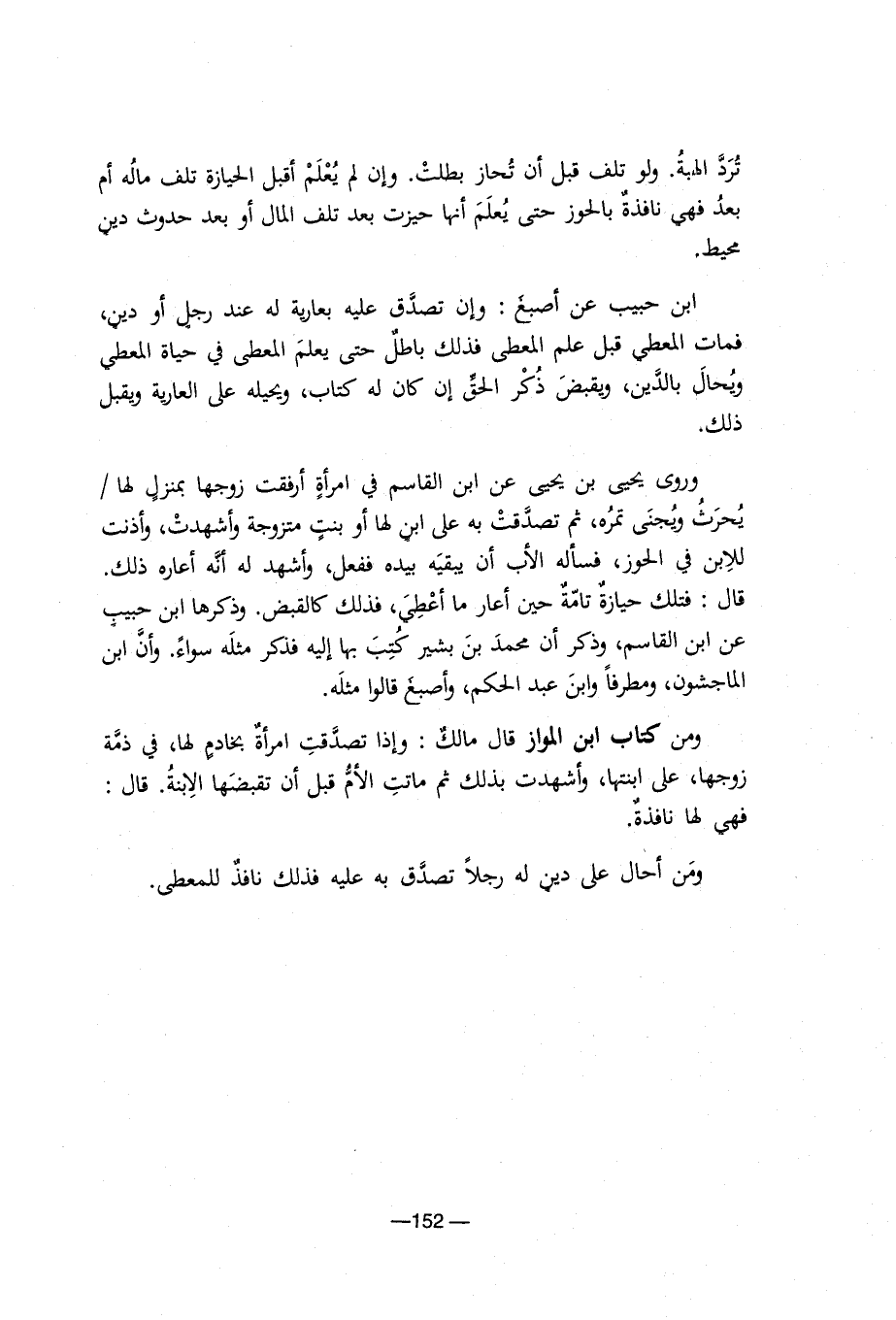 تُرَدَّ الهبة. ولو تلف قبل أن تحاز بطلت. وإن لم يُعْلَمْ أقبل الحيازة تلف ماله أم بعد فهي نافذة بالحوز حتى يعلم أنها حيزت بعد تلف المال أو بعد حدوث دين محيط. ابن حبيب عن أصبغ: وإن تصدق عليه بعارية له عند رجل أو دين، فمات المعطي قبل علم المعطى فذلك باطل حتى يعلم المعطى في حياة المعطي ويحال بالدين، ويقبض ذُكْر الحق إن كان له كتاب، ويحيله على العارية ويقبل ذلك. وروى يحيى بن يحيى عن ابن القاسم في امرأة أرفقت زوجها بمنزل لها/ يُحرَثُ ويجنى تمره، ثم تصدقت به على ابن لها أو بنت متزوجة وأشهدت، وأذنت للابن في الحوز، فسأله الأب أن يبقيه بيده ففعل، وأشهد له أنه أعاره ذلك. قال: فتلك حيازة تامة حين أعار ما أعْطِيَ، فذلك كالقبض. وذكرها ابن حبيب عن ابن القاسم، وذكر أن محمد بن بشير كتب بها إليه فذكر مثله سواء. وأن ابن الماجشون، ومطرفا وابن عبد الحكم، وأصبغ قالوا مثله. ومن كتاب ابن المواز قال مالك: وإذا تصدقت امرأة بخادم لها، في ذمة زوجها، على ابنتها، وأشهدت بذلك ثم ماتت الأم قبل أن تقبضها الابنة. قال: فهي لها نافذة. ومن أحال على دين له رجلا تصدق به عليه فذلك نافذ للمعطى.