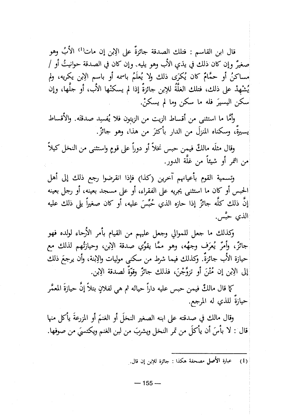 قال ابن القاسم: فتلك الصدقة جائزة على الابن إن مات (¬1) الأب وهو صغير وإن كان ذلك في يدي الأب وهو يليه. وإن كان في الصدقة حوانيت أو/ مساكن أو حمام كان يُكرَى ذلك ولا يعلم باسمه أو باسم الابن يكريه، ولم يُشْهِدْ على ذلك، فتلك الغلة للابن جائزة إذا لم يسكنها الأب، او جلها، وإن سكن اليسير فله ما سكن وما لم يسكن. وأما ما استثنى من أقساط الزيت من الزيتون فلا يفسد صدقته. والأقساط يسيره، وسكناه المنزل من الدار بأكثر من هذا، وهو جائز. وقال مثله مالك فيمن حبس نخلا أو دورا على قوم واستثنى من النخل كيلا من التمر أو شيئا من غلة الدور. وتسمية القوم بأعيانهم آخرين (كذا) فإذا انقرضوا رجع ذلك إلى أهل الحبس أو كان ما استثنى يجريه على الفقراء، أو على مسجد بعينه، أو رجل بعينه إن ذلك كله جائز إذا حازه الذي حبس عليه، أو كان صغيرا يلي ذلك عليه الذي حبس. وكذلك ما جعل للموالي وجعل عليهم من القيام بأمر الأرحاء لولده فهو جائز، وأمر يُعَرف وجهه، وهو مما يقوي صدقة الابن، وحيازتهم لذلك مع حيازة الأب جائزة. وكذلك فيما شرط من سكنى موليات والابنة، وأن يرجع ذلك إلى الابن إن مُتْنَ أو تزوجن، فذلك جائز وقوة لصدقة الابن. كما قال مالك فيمن حبس عليه دارا حياته ثم هي لفلان بتلا إن حيازة المعمر حيازة للذي له المرجع. وقال مالك في صدقته على ابنه الصغير النخل أو الغنم أو المزرعة يأكل منها قال: لا بأس أن يأكل من تمر النخل ويشرب من لبن الغنم ويكتسي من صوفها.