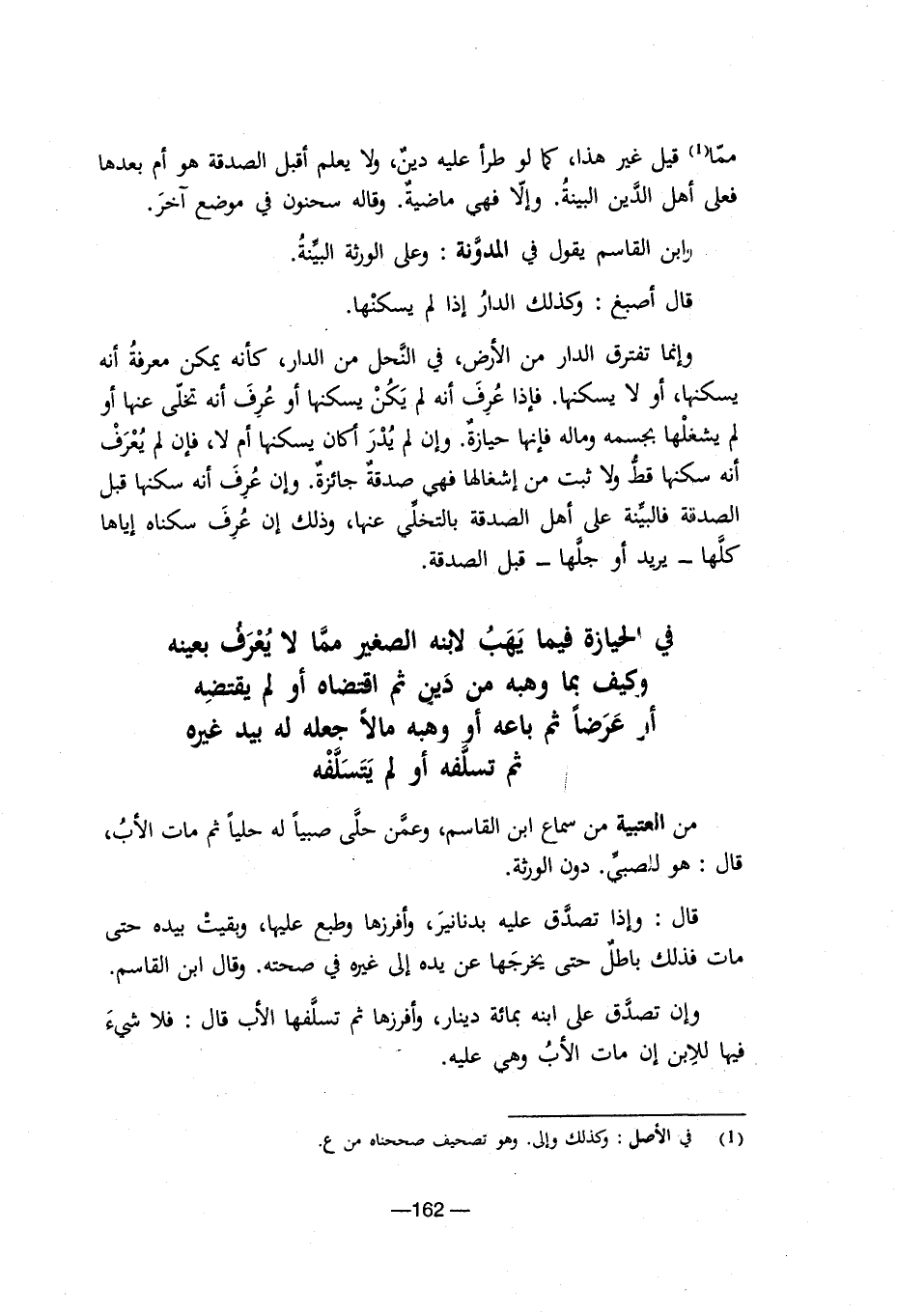مما (¬1) قيل غير هذا، كما لو طرأ عليه دين، ولا يعلم أقبل الصدقة هو أم بعدها فعلى أهل الدين البينة. وإلا فهي ماضية. وقاله سحنون في موضع آخر. وابن القاسم يقول في المدونة: وعلى الورثة البينة. قال أصبغ: وكذلك الدار إذا لم يسكنها. وإنما تفترق الدار من الأرض، في النحل من الدار، كأنه يمكن معرفة أنه يسكنها، أو لا يسكنها. فإذا عرف أنه لم يكن يسكنها أو عرف أنه تخلى عنها أو لم يشغلها بجسمه وماله فإنها حيازة. وإن لم يُدْرَ أكان يسكنها أم لا، فإن لم يُعْرَفْ أنه سكنها قط ولا ثبت من إشغالها فهي صدقة جائزة. وإن عرف أنه سكنها قبل الصدقة فالبينة على أهل الصدقة بالتخلي عنها، وذلك إن عرف سكناه إياها كلها- يريد أو جلها- قبل الصدقة. في الحيازة فيما يهب لابنه الصغير مما لا يُعْرَفُ بعينه وكيف بما وهبه من دين ثم اقتضاه أو لم يقتضه أو عرضا ثم باعه أو وهبه مالا جعله له بيد غيره ثم تسلفه أو لم يَتَسَلَّفْه من العتبية من سماع ابن القاسم، وعمن حلى صبيا له حليا ثم مات الأب، قال: هو للصبي. دون الورثة. قال: وإذا تصدق عليه بدنانير، وأفرزها وطبع عليها، وبقيت بيده حتى مات فذلك باطل حتى يخرجها عن يده إلى غيره في صحته. وقال ابن القاسم. وإن تصدق على ابنه بمائة دينار، وأفرزها ثم تسلفها الأب قال: فلا شيء فيها للابن إن مات الأب وهي عليه.