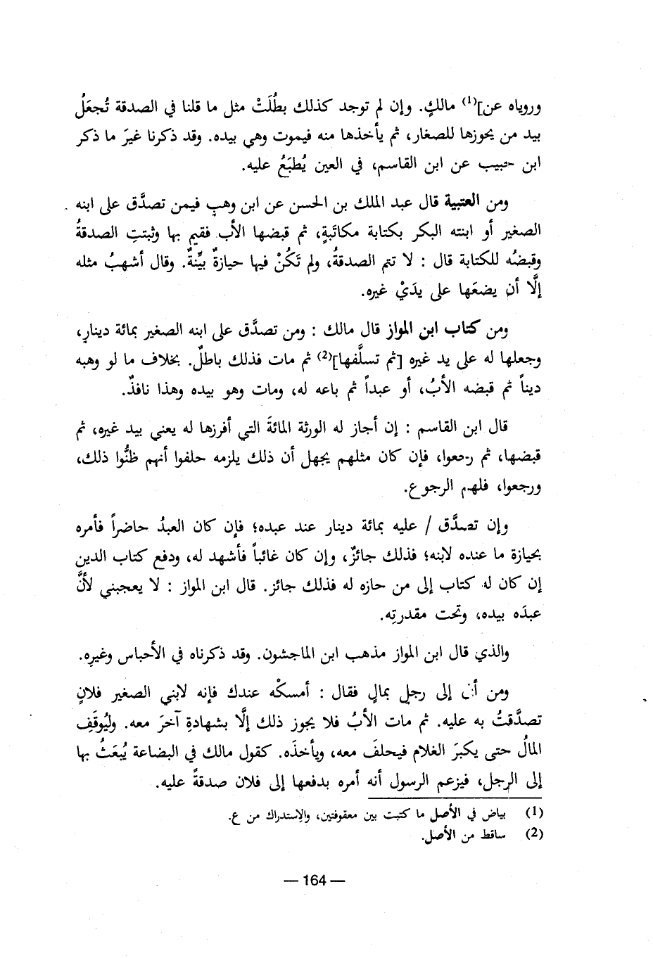 وروياه عن] (¬1) مالك. وإن لم توجد كذلك بطُلَتْ مثل ما قلنا في الصدقة تُجعَلُ بيد من يحوزها للصغار، ثم يأخذها منه فيموت وهي بيده. وقد ذكرنا غير ما ذكر ابن حبيب عن ابن القاسم، في العين يطبع عليه. ومن العتبية قال عبد المالك بن الحسن عن ابن وهب فيمن تصدق على ابنه الصغير أو ابنته البكر بكتابة مكاتبة، ثم قبضها الأب فقيم بها وثبتت الصدقة وقبضه للكتابة قال: لا تتم الصدقة، ولم تَكُنْ فيها حيازة بينة. وقال أشهب مثله إلا أ، يضعها على يدي غيره. ومن كتاب ابن المواز قال مالك: ومن تصدق على ابنه الصغير بمائة دينار، وجعلها له على يد غيره [ثم تسلفها] (¬2) ثم مات فذلك باطل. بخلاف ما لو وهبه دينا ثم قبضه الأب، أو عبدا ثم باعه له، ومات وهو بيده وهذا نافذ. قال ابن القاسم: إن أجاز له الورثة المائة التي أفرزها له يعني بيد غيره، ثم قبضها، ثم رجعوا فإن كان مثلهم يجهل أن ذلك يلزمه حلفوا أنهم ظنوا ذلك، ورجعوا، فلهم الرجوع. وإن تصدق/ عليه بمائة دينار عند عبده؛ فإن كان العبد حاضرا فأمره بحيازة ما عنده لابنه؛ فذلك جائز، وإن كان غائبا فأشهد له، ودفع كتاب الدين إن كان له كتاب إلى من حازه له فذلك جائز. قال ابن المواز: لا يعجبني لأن عبده بيده، وتحت مقدرته. والذي قال ابن المواز مذهب ابن الماجشون. وقد ذكرناه في الأحباس وغيره. ومن أن إلى رجل بمال فقال: أمسكه عندك فإنه لابني الصغير فلان تصدقت به عليه. ثم مات الأب فلا يجوز ذلك إلا بشهادة آخر معه. وليُوقَفِ المال حتى يكبر الغلام فيحلف معه، ويأخذه. كقول مالك في البضاعة يُبعَثُ بها إلى الرجل، فيزعم الرسول أنه أمره بدفعها إلى فلان صدقة عليه.