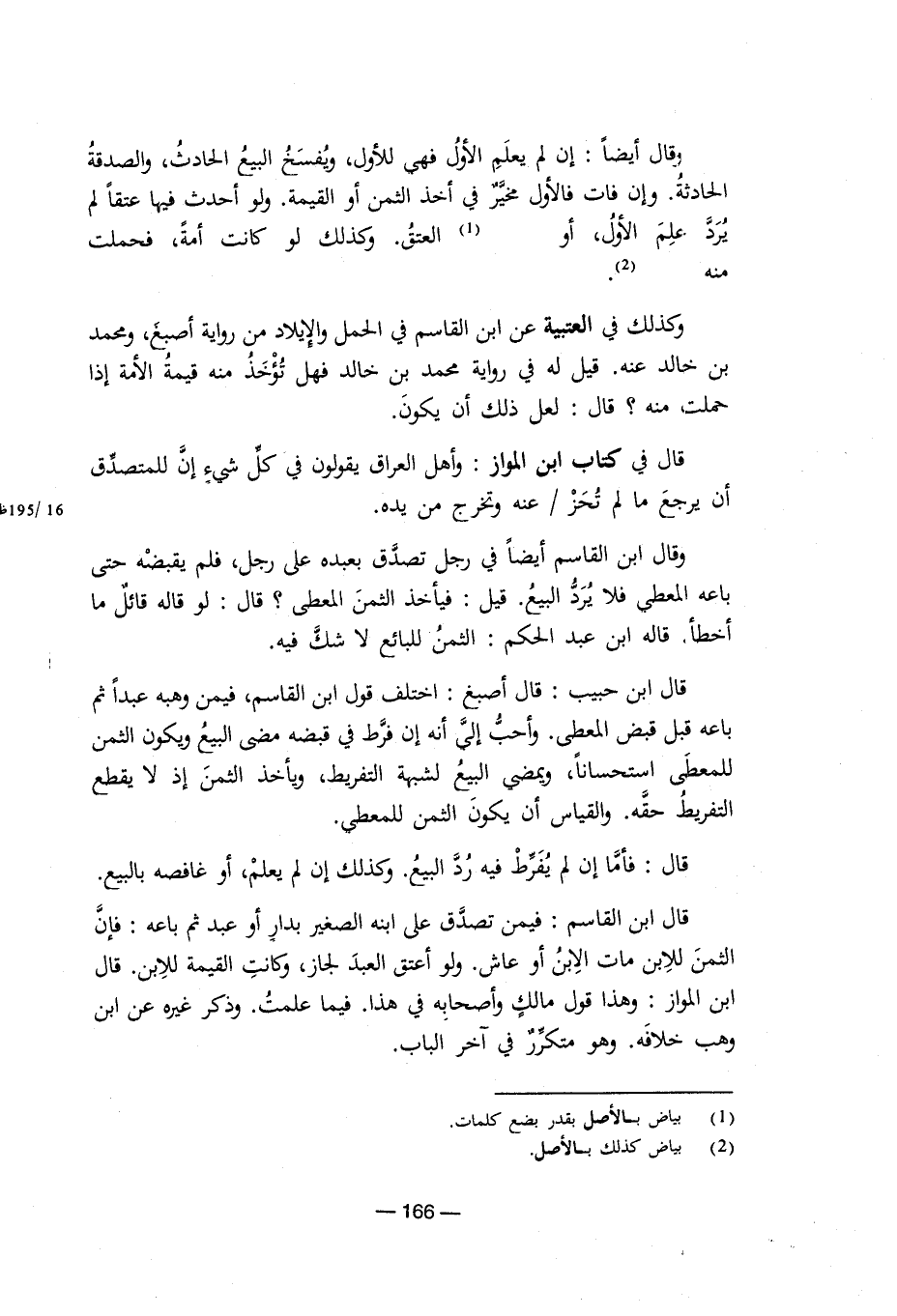 وقال أيضا: إن لم يعلم الأول فهي للأول، ويُفسَخُ البيع الحادث، والصدقة الحادثة. وإن فات فالأول مخير في أخذ الثمن أو القيمة. ولو أحدث فيها عتقا لم يرد علم الأول، أو (¬1) العتق. وكذلك لو كانت أمة، فحملت منه (¬2). وكذلك في العتبية عن ابن القاسم في الحمل والإيلاد من رواية أصبغ، ومحمد بن خالد عنه. قيل له في رواية محمد بن خالد فهل تُؤْخَذُ منه قيمة الأمة إذا حملت منه؟ قال: لعل ذلك أن يكون. قال في كتاب ابن المواز: وأهل العراق يقولون في كل شيء إن للمتصدق أن يرجع ما لم تحز/ عنه وتخرج من يده. وقال ابن القاسم أيضا في رجل تصدق بعبده على رجل، فلم يقبضه حتى باعه المعطي فلا يُرَدُّ البيع. قيل: فيأخذ الثمن المعطى؟ قال: لو قاله قائل ما أخطأ. قاله ابن عبد الحكم: الثمن للبائع لا شك فيه. قال ابن حبيب: قال أصبغ: اختلف قول ابن القاسم، فيمن وهبه عبدا ثم باعه قبل قبض المعطى. وأحب إلي أنه إن فرط في قبضه مضى البيع ويكون الثمن للمعطى استحسانا، ويمضي البيع لشبهة التفريط، ويأخذ الثمن إذ لا يقطع التفريط حقه. والقياس أن يكون الثمن للمعطي. قال: فأما إن لم يفرط فيه رد البيع. وكذلك إن لم يعلم، أو غافصه بالبيع. قال ابن القاسم: فيمن تصدق على ابنه الصغير بدار أو عبد ثم باعه: فإن الثمن للابن مات الابن أو عاش. ولو أعتق العبد لجاز، وكانت القيمة للابن. قال ابن المواز: وهذا قول مالك وأصحابه في هذا. فيما علمت. وذكر غيره عن ابن وهب خلافه. وهو متكرر في آخر الباب.