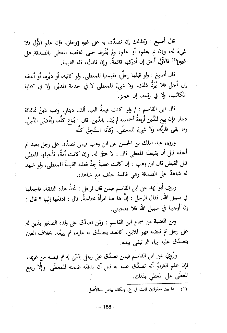 قال أصبغ: وكذلك إن تصدق به على غيره [وحاز، فإن علم الأول فلا شيء له، وإن لم يعلم، أو علم، ولم يفرط حتى غافصه المعطي بالصدقة على غيره] (¬1) فالأول أحق إن أدركها قائمة. وإن فاتت، فله القيمة. قال أصبغ: ولو قبلها رجل، فقيمتها للمعطى. ولو كاتبه، أو دبره، أو أعتقه إلى أجل فلا يرد ذلك، ولا شيء للمعطى لا في خدمة المدبر، ولا في كتابة المكاتب، ولا في رقبته، إن عجز. قال ابن القاسم:/ ولو كانت قيمة العبد ألف دينار، وعليه دين ثمانمائة دينار فإن بيع للدين أربعة أخماسه لم يف بالدين. قال: يباع كله، ويُقْضَى الدين. وما بقي فلربه، ولا شيء للمعطى. وكأنه استحق كله. وروى عبد الملك بن الحسن عن ابن وهب فيمن تصدق على رجل بعبد ثم أعتقه قبل أن يقبضه المعطى قال: لا عتق له. وإن كانت أمة، فأحبلها المعطي قبل القبض قال ابن وهب: إن كانت عطية جد فعليه القيمة للمعطى، ولو شهد له شاهد على الصدقة وهي قائمة حلف مع شاهده. وروى أبو زيد عن ابن القاسم فيمن قال لرجل: خذ هذه النفقة، فاجعلها في سبيل الله. فقال الرجل: إن ها هنا امرأة محتاجة. قال: ادفعها إليها؟ قال: إن أوجبها في سبيل الله فلا يعجبني. ومن العتبية من سماع ابن القاسم: ومن تصدق على ولده الصغير بدين له على رجل ثم قبضه فهو للابن. كالعبد يتصدق به عليه، ثم يبيعه. بخلاف العين يتصدق عليه بها، ثم تبقى بيده. وروي عن ابن القاسم فيمن تصدق على رجل بدين له ثم قبضه من غريمه، فإن علم الغريم أنه تصدق عليه به قبل أن يدفعه ضمنه للمعطى. وإلا رجع المعطى على المعطي بذلك.