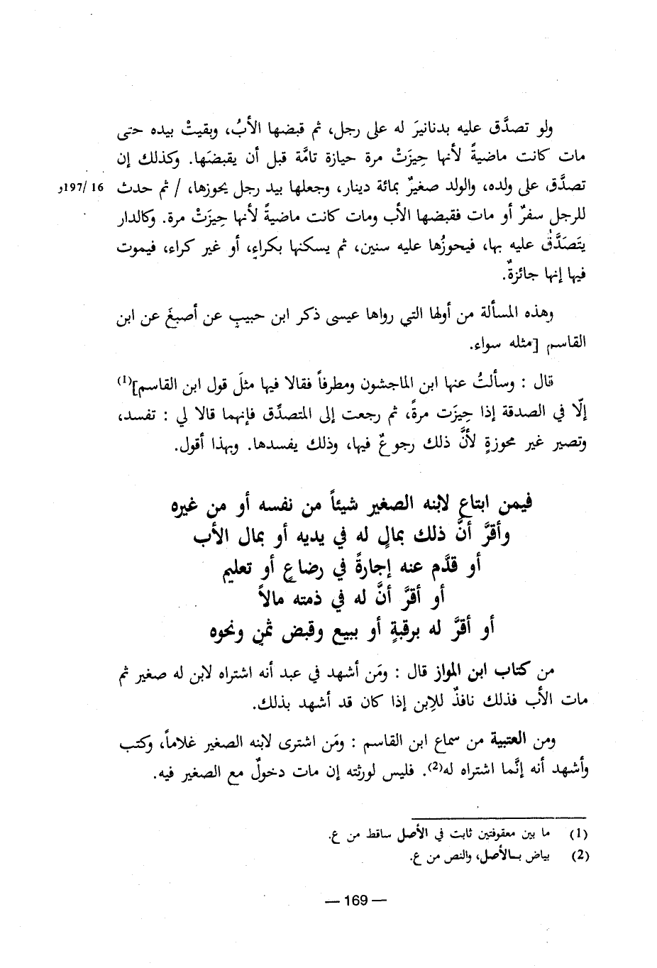 ولو تصدق عليه بدنانير له على رجل، ثم قبضها الأب، وبقيت بيده حتى مات كانت ماضية لأنها حيزت مرة حيازة تامة قبل أن يقبضها. وكذلك إن تصدق على ولده، والولد صغير بمائة دينار، وجعلها بيد رجل يحوزها،/ ثم حدث للرجل سفر أو مات فقبضها الأب ومات كانت ماضية لأنها حِيزَتْ مرة. وكالدار يتصدق عليه بها، فيحوزها عليه سنين، ثم يسكنها بكراء، أو غير كراء، فيموت فيها إنها جائزة. وهذه المسألة من أولها التي رواها عيسى ذكر ابن حبيب عن أصبغ عن ابن القاسم [مثله سواء. قال: وسألت عنها ابن الماجشون ومطرفا فقالا فيها مثل قول ابن القاسم] (¬1) إلا في الصدقة إذا حيزت مرة، ثم رجعت إلى المتصدق فإنهما قالا لي: تفسد، وتصير غير محوزة لأن ذلك رجوع فيها، وذلك يفسدها. وبهذا أقول. فيمن ابتاع لابنه الصغير شيئا من نفسه أو من غيره وأقر أن ذلك بمال له في يديه أو بمال الأب أو قدم عنه إجارة في رضاع أو تعليم أو أقر أن له في ذمته مالا أو أقر له برقبة أو ببيع وقبض ثمن ونحوه من كتاب ابن المواز قال: ومن أشهد في عبد أنه اشتراه لابن له صغير ثم مات الأب فذلك نافذ للابن إذا كان قد أشهد بذلك. ومن العتبية من سماع ابن القاسم: ومن اشترى لابنه الصغير غلاما، وكتب وأشهد أنه إنما اشتراه له (¬2). فليس لورثته إن مات دخول مع الصغير فيه.