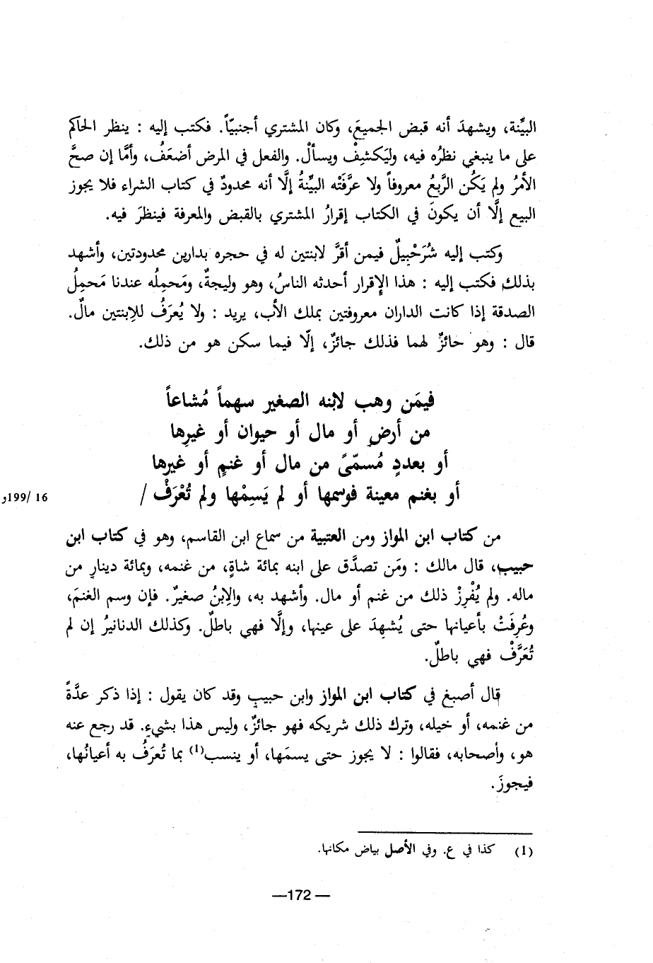 البينة، ويشهد أنه قبض الجميع، وكان المشتري أجنبيا. فكتب إليه: ينظر الحاكم على ما ينبغي نظره فيه، وليكشف ويسأل. والفعل في المرض أضعف، وأما إن صح الأمر ولم يكن الربع معروفا ولا عرفته البينة إلا أنه محدود في كتاب الشراء فلا يجوز البيع إلا أ، يكون في الكتاب إقرار المشتري بالقبض والمعرفة فينظر فيه. وكتب إليه شُرَحْبِيلُ فيمن أقر لابنتين له في حجره بدارين محدودتين، وأشهد بذلك فكتب إليه: هذا الإقرار أحدثه الناس، وهو وليجة، ومحمله عندنا محمل الصدقة إذا كانت الداران معروفتين بملك الأب، يريد: ولا يعرف للابنتين مال. قال: وهو حائز لهما فذلك جائز، إلا فيما سكن هو من ذلك. فيمن وهب لابنه الصغير سهما مشاعا من أرض أو مال أو حيوان أو غيرها أو بعدد مسمى من مال أو غنم أو غيرها أو بغنم معينة فوسمها أو لم يسمها ولم تُعْرَفْ/ من كتاب ابن المواز ومن العتبية من سماع ابن القاسم، وهو في كتاب ابن حبيب، قال مالك: ومن تصدق على ابنه بمائة شاة، من غنمه، وبمائة دينار من ماله. ولم يفرز ذلك من غنم أو مال. وأشهد به، والابن صغير. فإن وسم الغنم، وعرفت بأعيانها حتى يشهد على عينها، وإلا فهي باطل. وكذلك الدنانير إن لم تُعَرَّفْ فهي باطل. قال أصبغ في كتاب ابن المواز وابن حبيب وقد كان يقول: إذا ذكر عدة من غنمه، أو خيله، وترك ذلك شريكه فهو جائز، وليس هذا بشيء. قد رجع عنه هو، وأصحابه، فقالوا: لا يجوز حتى يسمها، أو ينسب (¬1) بما تُعرَفُ به أعيانها، فيجوز.