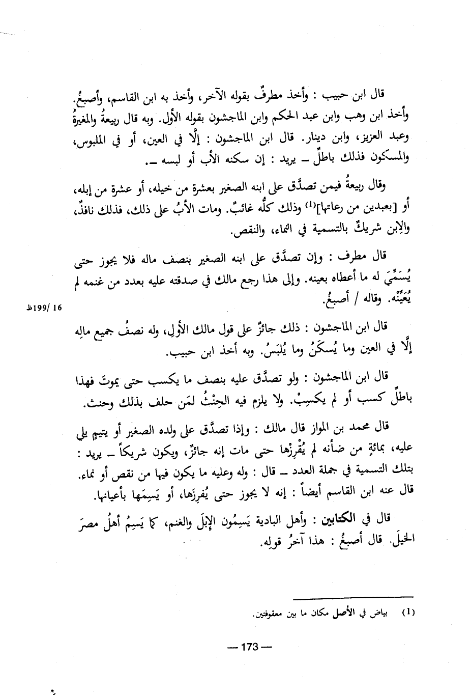 قال ابن حبيب: وأخذ مطرف بقوله الآخر، وأخذ به ابن القاسم، وأصبغ. وأخذ ابن وهب وابن عبد الحكم وابن الماجشون بقوله الأول. وبه قال ربيعة والمغيرة وعبد العزيز، وابن دينار. قال ابن الماجشون: إلا في العين، أو في الملبوس، والمسكون فذلك باطل- يريد: إن سكنه الأب أو لبسه-. وقال ربيعة فيمن تصدق على ابنه الصغير بعشرة من خيله، أو عشرة من إبله، أو [بعبدين من رعاتها] (¬1) وذلك كله غائب. ومات الأب على ذلك، فذلك نافذ، والابن شريك بالتسمية في النماء، والنقص. قال مطرف: وإن تصدق على ابنه الصغير بنصف ماله فلا يجوز حتى يسمى له ما أعطاه بعينه. وإلى هذا رجع مالك في صدقته عليه بعدد من غنمه لم يعينه. وقاله/ أصبغ. قال ابن الماجشون: ذلك جائز على قول مالك الأول، وله نصف جميع ماله إلا في العين وما يسكن وما يلبس. وبه أخذ ابن حبيب. قال ابن الماجشون: ولو تصدق عليه بنصف ما يكسب حتى يموت فهذا باطل كسب أو لم يكسب. ولا يلزم فيه الحنث لمن حلف بذلك وحنث. قال محمد بن المواز قال مالك: وإذا تصدق على ولده الصغير أو يتيم يلي عليه، بمائة من ضأنه لم يقرزها حتى مات إنه جائز، ويكون شريكا- يريد: بتلك التسمية في جملة العدد- قال: وله وعليه ما يكون فيها من نقص أو نماء. قال عنه ابن القاسم أيضا: إنه لا يجوز حتى يفرزها، أو يسمها بأعيانها. قال في الكتابين: وأهل البادية يسمون الإبل والغنم، كما يسم أهل مصر الخيل. قال أصبغ: هذا آخر قوله.