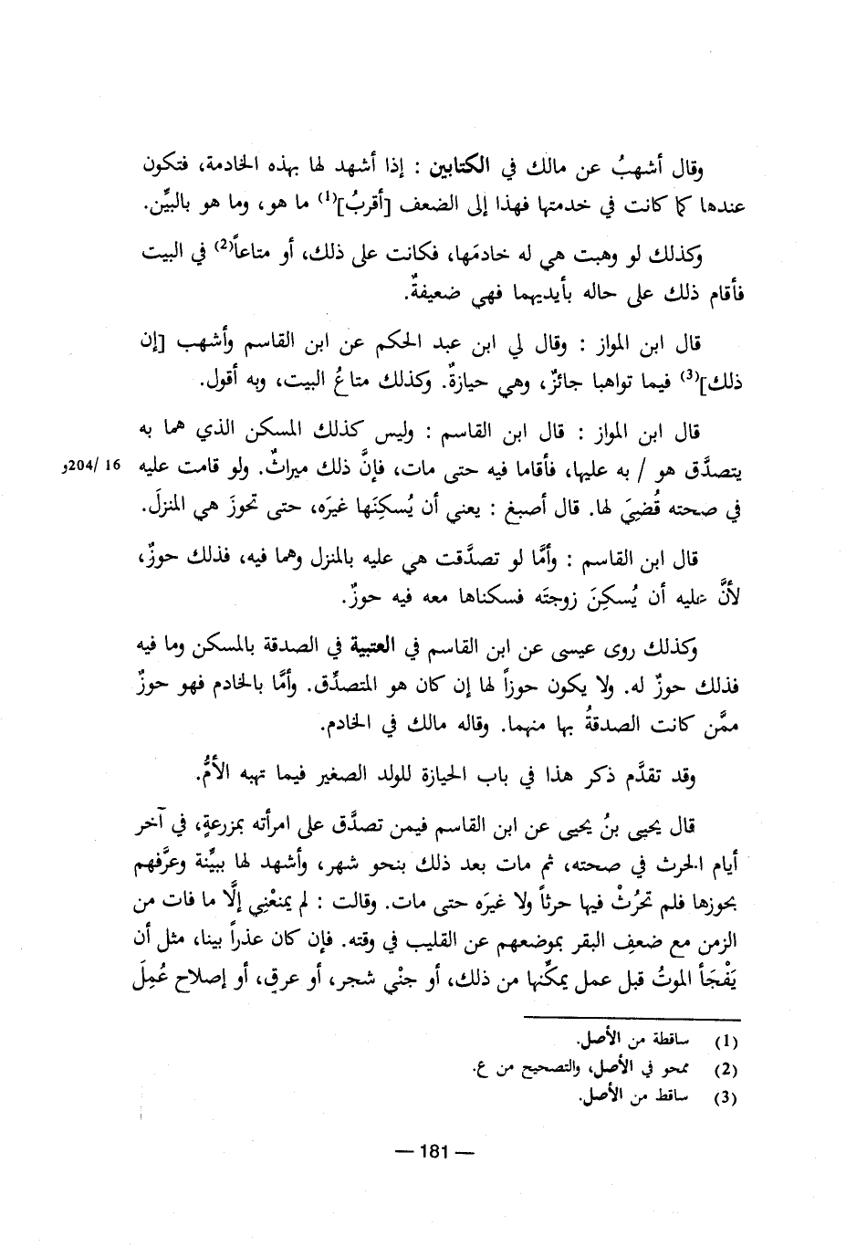 وقال أشهب عن مالك في الكتابين: إذا أشهد لها بهذه الخادمة، فتكون عندها اكانت في خدمتها فهذا إلى الصعف [أقرب] (¬1) ما هو، وما هو بالبين. وكذلك لو وهبت هي له خادمها، فكانت على ذلك، أو متاعا (¬2) في البيت فأقام ذلك على حاله بأيديهما فهي ضعيفة. قال ابن المواز: وقال لي ابن عبد الحكم عن ابن القاسم وأشهب [إن ذلك] (¬3) فيما تواهبا جائز، وهي حيازة. وكذلك متاع البيت، وبه أقول. قال ابن المواز: قال ابن القاسم: وليس كذلك المسكن الذي هما به يتصدق هو/ به عليها، فأقاما فيه حتى مات، فإن ذلك ميراث. ولو قامت عليه في صحته قضي لها. قال أصبغ: يعني أن يسكنها غيره، حتى تحوز هي المنزل. قال ابن القاسم: وأما لو تصدقت هي عليه بالمنزل وهما فيه، فذلك حوز، لأن عليه أن يسكن زوجته فسكناها معه فيه حوز. وكذلك روى عيسى عن ابن القاسم في العتبية في الصدقة بالمسكن وما فيه فذلك حوز له. ولا يكون حوزا لها إن كان هو المتصدق. وأما بالخادم فهو حوز ممن كانت الصدقة منهما. وقاله مالك في الخادم. وقد تقدم ذكر هذا في باب الحيازة للولد الصغير فيما تهبه الأم. قال يحيى بن يحيى عن ابن القاسم فيمن تصدق على امرأته بمزرعة، في آخر أيام الحرث في صحته، ثم مات ك بنحو شهر، وأشهد لها ببينة وعرفهم بحوزها فلم تحرث فيها حرثا ولا غيره حتى مات. وقالت: لم يمنعني إلا ما فات من الزمن مع ضعف البقر بموضعهم عن القليب في وقته. فإن كان عذرا بينا، مثل أن يفجأ الموت قبل عمل يمكنها من ذلك، أو جني شجر، أو عرق، أو إصلاح عمل
